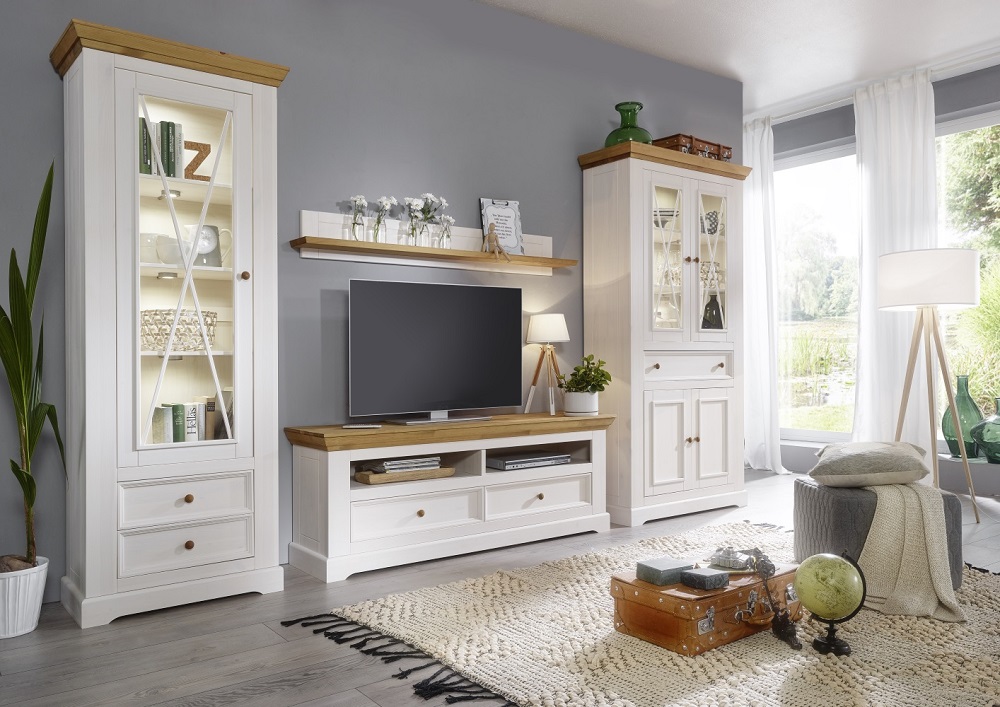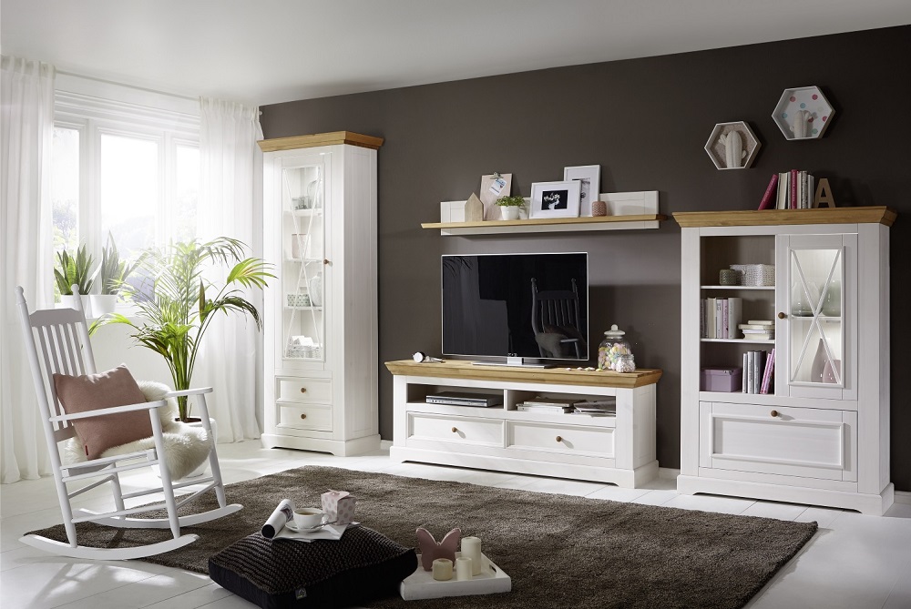 Das Wohnprogramm WZ-0133 im eleganten Landhaus-Stil sorgt für strahlende Helligkeit und entspannende Romantik. Ein muss in jedem Wohnzimmer. Stellen Sie sich einfach Ihre individuelle Wohnwand zusammen. Dank der zahlreichen Möglichkeiten die das Wohnprogramm WZ-0133 mit sich bringt. Das Lowboard I setzt Ihren Fernseher perfekt in Szene. Hinter den zwei Türen und in den zwei Schubkästen befindet sich genügend Stauraum für DVD's, Fernbedienungen und Zeitschriften. In dem offenen Fach können verschiedene Geräte wie DVD-Player oder Spielekonsole untergebracht werden. Für mehr Romantik im Wohnbereich, das Lowboard I WZ-0133.Hinweis für Massivholzmöbel:Bitte beachten Sie, dass Massivholz ein natürliches Material ist und daher einige Merkmale aufweisen kann, die seinen einzigartigen Charakter ausmachen. Massivholz kann Astlöcher, Wuchsrisse, Farbunterschiede und andere natürliche Merkmale aufweisen. Diese Unterschiede sind kein Grund zur Beanstandung, sondern zeugen von der Authentizität des Materials und verleihen jedem Möbelstück seinen individuellen Charme. Holz kann im Laufe der Zeit nachdunkeln oder aufgrund von Lichteinwirkung seine Farbe verändern. Diese Veränderungen sind normal und unterstreichen die natürliche Schönheit des Materials. Bitte zögern Sie nicht, wenden Sie sich bei Rückfragen gern an unseren Kundendienst.