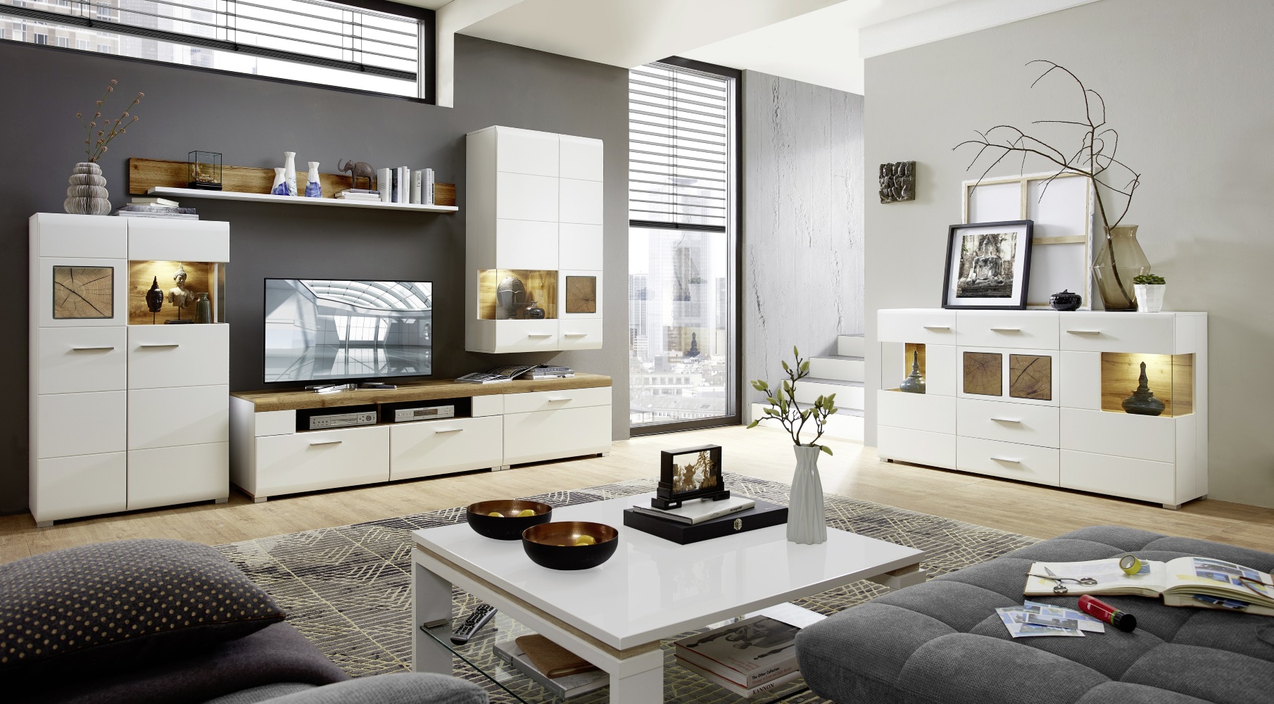 Ihre Familienspiele, Fotoalben sowie Akten und Unterlagen können Sie hinter den Holztüren geordnet und griffbereit aufbewahren. Einen besonderen Auftritt hat Ihr Smart-TV auf dem Lowboard, denn es kommt auf dem Möbelstück perfekt zur Geltung. In den Schubkästen haben Ihre Sammlungen aus DVDs, CDs und die Batterien für die Funkfernbedienungen ausreichend Platz. Den Receiver, die Spielekonsolen oder aber auch den DVD-Player können Sie optimal in den offenen Fächern aufbewahren. Ihre Lieblingsbücher und zierlichen Zimmerpflanzen haben auf dem Wandboard einen glanzvollen Auftritt. Durch die integrierte Beleuchtung rücken Sie zusätzlich Ihre Schätze in das rechte Licht und lassen diese zu einem Eye-Catcher werden. Die Traummöbel in Weiß sollten Sie noch heute bei sich einziehen lassen. Wählen Sie noch weitere Favoriten aus und bereichern Sie damit Ihr Zuhause.