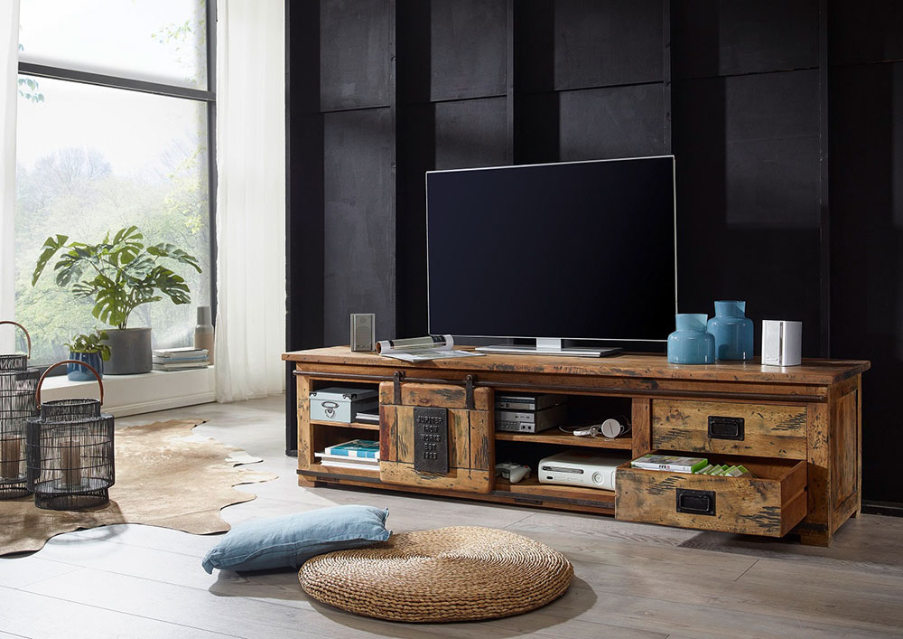 Ein Blickfang, der jedes Wohnzimmer gezielt aufzuwerten weiß, ist das TV-Board WZ-480. Während für Korpus und Front Massivholz verwendet wird, kommt bei der Herstellung der Griffstücke, Auszüge und Scharniere Eisen zum Einsatz. Hinter den zwei Rolltüren und in dem Schubfach findet sich viel Stauraum. Dort können alle möglichen Wohnzimmerutensilien untergebracht werden. Auf der Oberplatte lässt sich der Fernseher platzieren. Das TV-Board WZ-480 ist ein Highlight für den Wohnbereich und sorgt für eine Menge Stauraum. Mit dem Maß von nur ca. B/H/T: 160x50x45 cm passt das TV-Board auch in kleine Räume.Hinweis für Massivholzmöbel:Bitte beachten Sie, dass Massivholz ein natürliches Material ist und daher einige Merkmale aufweisen kann, die seinen einzigartigen Charakter ausmachen. Massivholz kann Astlöcher, Wuchsrisse, Farbunterschiede und andere natürliche Merkmale aufweisen. Diese Unterschiede sind kein Grund zur Beanstandung, sondern zeugen von der Authentizität des Materials und verleihen jedem Möbelstück seinen individuellen Charme. Holz kann im Laufe der Zeit nachdunkeln oder aufgrund von Lichteinwirkung seine Farbe verändern. Diese Veränderungen sind normal und unterstreichen die natürliche Schönheit des Materials. Bitte zögern Sie nicht, wenden Sie sich bei Rückfragen gern an unseren Kundendienst.