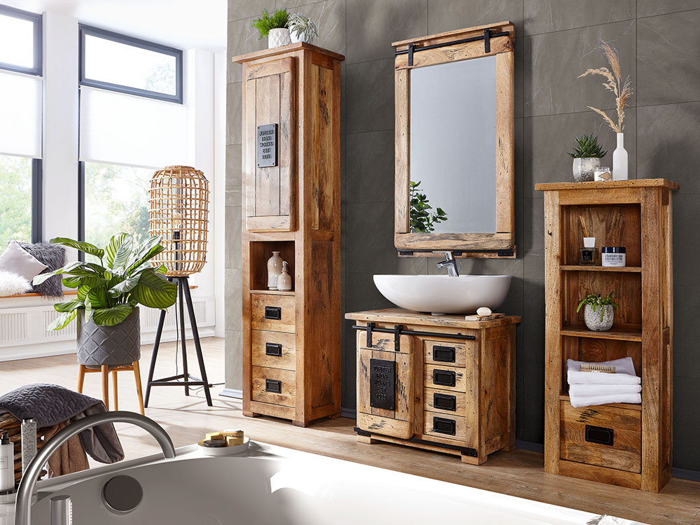 Mit dem Unterschrank I der Badmöbel-Serie BA-0480 erhalten Sie eine tolle Stauraumlösung, ideal für Ihren Bad-Bereich. Aus massivem Mangoholz gefertigt, begeistert der Unterschrank I durch hochwertige Materialien und einer tollen Verarbeitungsqualität. Das handwerkliche Meisterstück erhält durch eine aufwendig bearbeitete Holzoberfläche, gewollte Verfärbungen die dem Unterschrank I einen einzigartigen Vintage Look im schicken Industrial Stil verleihen. Individuelle Maserungen machen aus jedem Möbelstück ein echtes Unikat. Beschläge und Applikationen aus Eisen vollenden das rustikale Auftreten des hochwertigen Badmöbels. Vier Schubkästen liefern praktischen Stauraum, hinter der Schiebetür verbergen sich zwei Fächer. Durch die Aussparung an der Rückseite verdeckt der Unterschrank I problemlos den Syphon Ihres Waschbeckens und lässt keine weiteren Wünsche offen. Schick und rustikal verleiht die Badmöbel-Serie BA-0480 Ihrem Badezimmer einen ganz besonderen Touch.Hinweis für Massivholzmöbel:Bitte beachten Sie, dass Massivholz ein natürliches Material ist und daher einige Merkmale aufweisen kann, die seinen einzigartigen Charakter ausmachen. Massivholz kann Astlöcher, Wuchsrisse, Farbunterschiede und andere natürliche Merkmale aufweisen. Diese Unterschiede sind kein Grund zur Beanstandung, sondern zeugen von der Authentizität des Materials und verleihen jedem Möbelstück seinen individuellen Charme. Holz kann im Laufe der Zeit nachdunkeln oder aufgrund von Lichteinwirkung seine Farbe verändern. Diese Veränderungen sind normal und unterstreichen die natürliche Schönheit des Materials. Bitte zögern Sie nicht, wenden Sie sich bei Rückfragen gern an unseren Kundendienst.