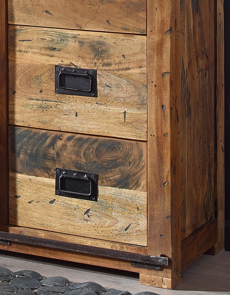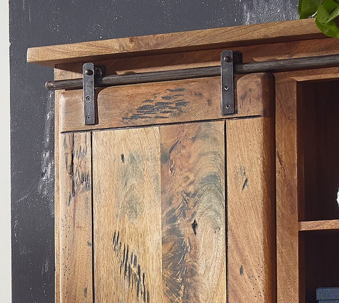 Ruhe und Harmonie, keine überflüssigen Details, Konzentration auf das Wesentliche und aus Mangoholz gefertigt. Mittlerweile ein Klassiker. Junges und entspanntes Wohnen in Reinkultur.Das Wohnprogramm im rustikalen, zeitlosen Stil sorgt mit der gewachsten und lackierten Farbausführung für strahlende Helligkeit und entspannende Romantik. Ein muss in jedem Wohnzimmer. Für die Produktion dieser Möbel wird ausschließlich massives Mangoholz verwendet. Stellen Sie sich einfach Ihre individuelle Wohnwand zusammen. Dank der zahlreichen Möglichkeiten, die das Wohnprogramm mit sich bringt. Bei diesen Möbeln aus dem Wohnprogramm sind die Türapplikationen aus Gusseisen, sowie die Schubkästen auf Holzschienen. Abgerundet wird das Massivholzprogramm durch den montierten Korpus.Hinweis für Massivholzmöbel:Bitte beachten Sie, dass Massivholz ein natürliches Material ist und daher einige Merkmale aufweisen kann, die seinen einzigartigen Charakter ausmachen. Massivholz kann Astlöcher, Wuchsrisse, Farbunterschiede und andere natürliche Merkmale aufweisen. Diese Unterschiede sind kein Grund zur Beanstandung, sondern zeugen von der Authentizität des Materials und verleihen jedem Möbelstück seinen individuellen Charme. Holz kann im Laufe der Zeit nachdunkeln oder aufgrund von Lichteinwirkung seine Farbe verändern. Diese Veränderungen sind normal und unterstreichen die natürliche Schönheit des Materials. Bitte zögern Sie nicht, wenden Sie sich bei Rückfragen gern an unseren Kundendienst.