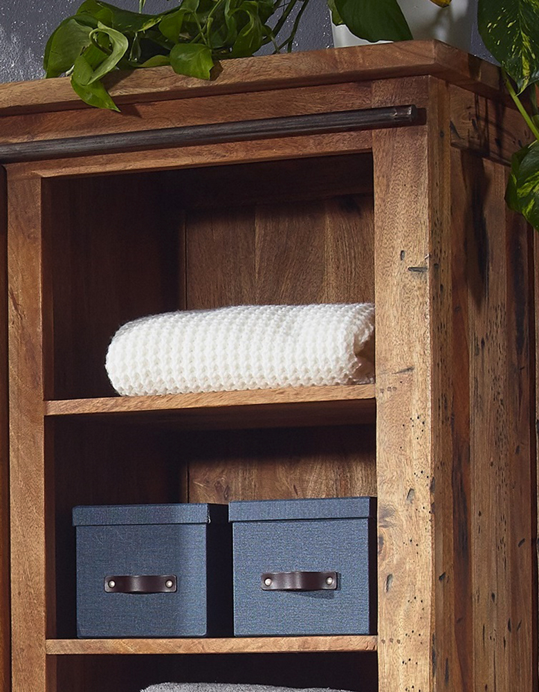 Ruhe und Harmonie, keine überflüssigen Details, Konzentration auf das Wesentliche und aus Mangoholz gefertigt. Mittlerweile ein Klassiker. Junges und entspanntes Wohnen in Reinkultur. Das Wohnprogramm im rustikalen, zeitlosen Stil sorgt mit der gewachsten und lackierten Farbausführung für strahlende Helligkeit und entspannende Romantik. Ein muss in jedem Wohnzimmer. Für die Produktion dieser Möbel wird ausschließlich massives Mangoholz verwendet. Stellen Sie sich einfach Ihre individuelle Wohnwand zusammen. Dank der zahlreichen Möglichkeiten, die das Wohnprogramm mit sich bringt. Bei diesen Möbeln aus dem Wohnprogramm sind die Türapplikationen aus Gusseisen, sowie die Schubkästen auf Holzschienen. Abgerundet wird das Massivholzprogramm durch den montierten Korpus.Hinweis für Massivholzmöbel:Bitte beachten Sie, dass Massivholz ein natürliches Material ist und daher einige Merkmale aufweisen kann, die seinen einzigartigen Charakter ausmachen. Massivholz kann Astlöcher, Wuchsrisse, Farbunterschiede und andere natürliche Merkmale aufweisen. Diese Unterschiede sind kein Grund zur Beanstandung, sondern zeugen von der Authentizität des Materials und verleihen jedem Möbelstück seinen individuellen Charme. Holz kann im Laufe der Zeit nachdunkeln oder aufgrund von Lichteinwirkung seine Farbe verändern. Diese Veränderungen sind normal und unterstreichen die natürliche Schönheit des Materials. Bitte zögern Sie nicht, wenden Sie sich bei Rückfragen gern an unseren Kundendienst.