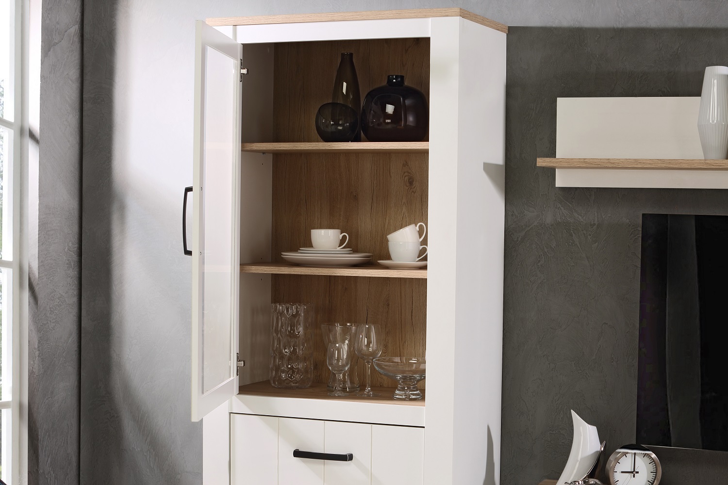 Vitrine Elara Weiß Matt Bianco Eiche Nb. Highboard Anrichte 1 Tür 1 Glastür
