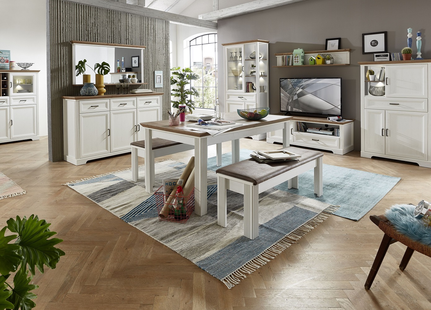 Im wundervollen, modernen Design präsentiert sich das Sideboard Jasmin in Pinie hell und Artisan Eiche. Für die Fronten in ansprechender Holzoptik wurde MDF verwendet, das Korpus besteht ebenfalls aus MDF. Das Innere des Sideboards Jasmin bietet viel Raum, zum Beispiel für Geschirr, Tischwäsche, Gesellschaftsspiele und vieles mehr. Zwei Schubladen und vier offene Fächer und zwei Türen sorgen für ausreichend Flexibilität bei der Aufbewahrung. Kleiner Tipp: Das Sideboard Jasmin lässt sich am besten ins Wohnzimmer, den Flur oder den Schlafbereich integrieren.