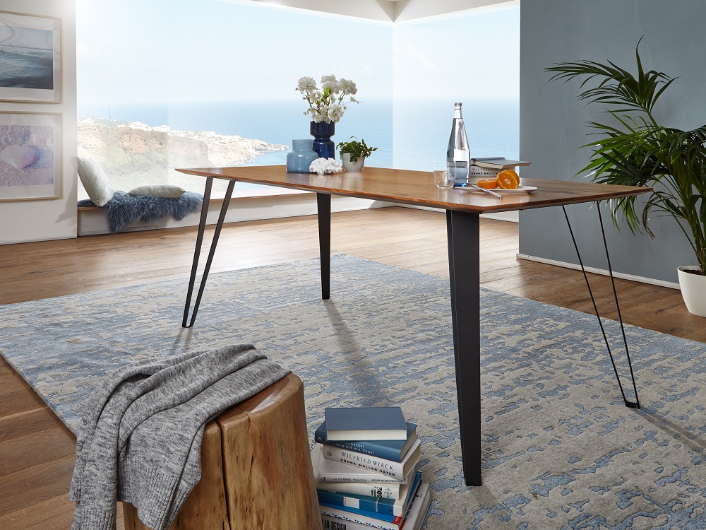 Der Esstisch TI-0483 aus Akazienholz und Metall holt den neusten Trend in Ihren Essbereich. Was den Esstisch TI-0483 so fasziniert? Der schöne Kontrast der Farben und die Leichtigkeit dank Schweizer Kante und den konischen Füßen. Mit einem Stellmaß von ca. B/H/T 180 ß 76 ß 90 cm passt der Esstisch TI-0483 auch in kleine Essecken. An dem Esstisch TI-0483 werden Sie gerne Ihre Mahlzeiten zu sich nehmen. Höchste Ansprüche vereint in modernes Design, das ist der Esstisch TI-0483.