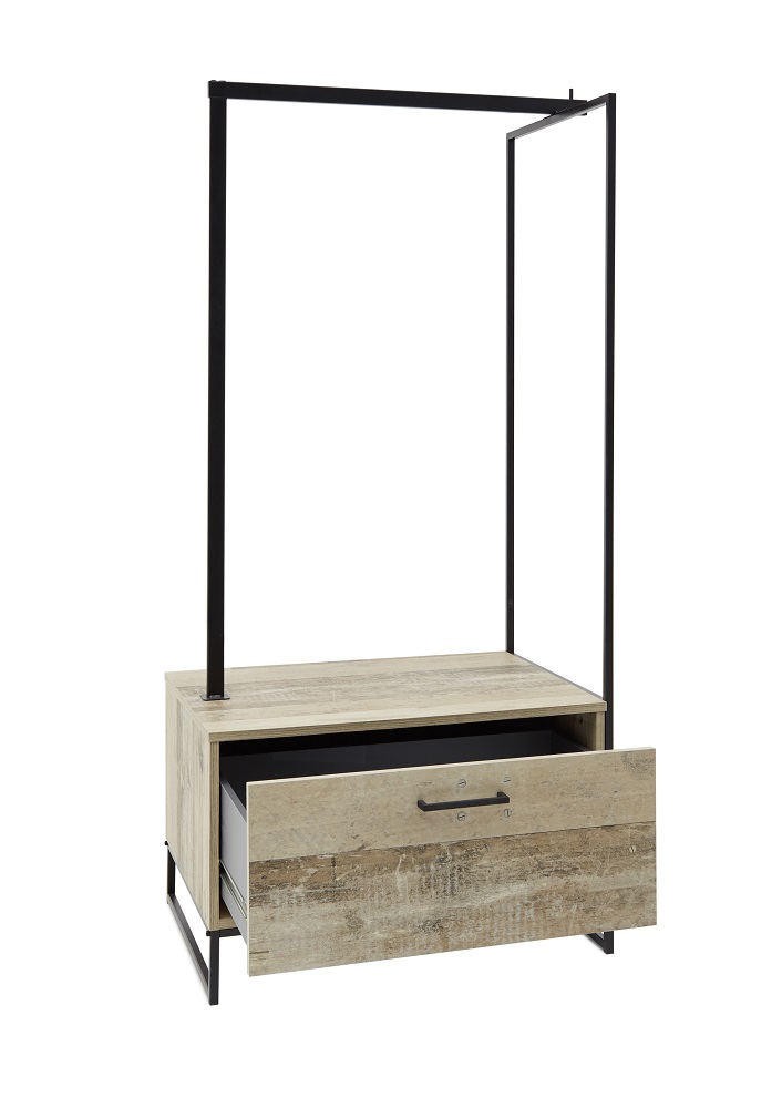 Eine passende Wahl für kleine Räume ist die Garderobe Roof. Die Garderobe Roof besteht aus einer Kleiderstange wo Sie Hemden oder Blusen griffbereit aufhängen können und einem Schubkasten in den Sie kleinere Utensilien Blickdicht verstauen können. Ihren Platz findet die Garderobe Roof im Schlafzimmer aber auch im Flur oder Diele ist sie sehr praktisch. Gefertigt wird die Garderobe Roof aus robusten MDF. Praktisch und für kleine Wohnräume gemacht, die Garderobe Roof in Old Style hell. Für das Schlafzimmer gemacht, die Garderobe Roof.