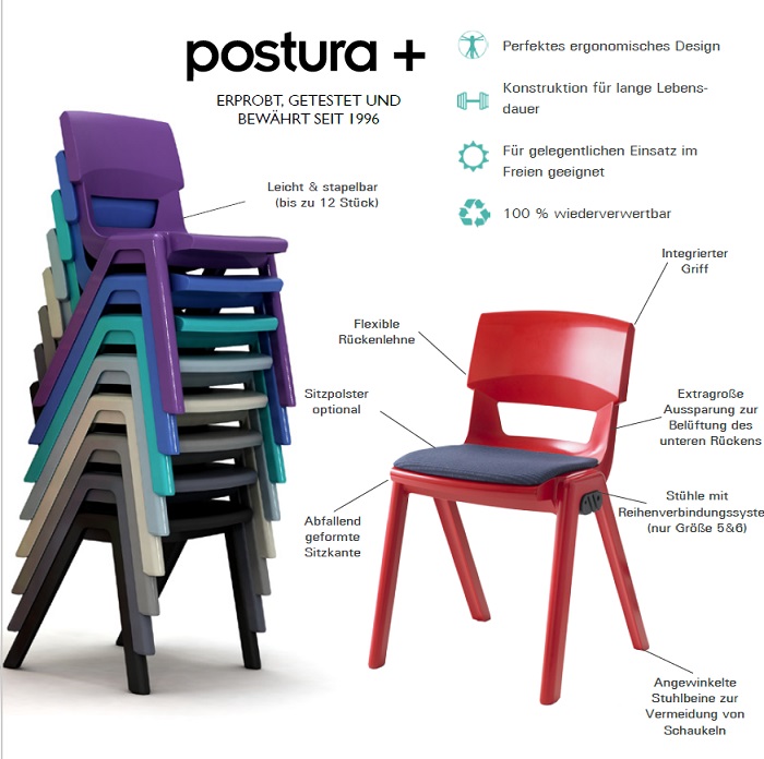 Der Stuhl Postura ist Ideal für den Einsatz in Kindergärten, Schulen, Mensen, Universitäten, Bibiliotheken, Warteräume, Meetingräume, Pausenräume, Pflegeheime und überall wo robuste und pflegeleichte Stapelstühle benötigt werden.