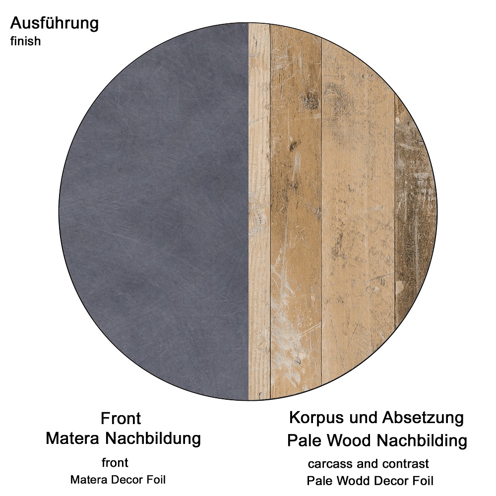 Eleganter Vitrinenschrank aus der Tailor Indy Möbelserie inkl. Beleuchtung. Die Front der Glasvitrine erstrahlt in einem grauen Matera Dekor. Um das schicke Design abzurunden wird bEleganter Vitrinenschrank aus der Tailor Indy Möbelserie inkl. Beleuchtung. Die Front der Glasvitrine erstrahlt in einem grauen Matera Dekor. Um das schicke Design abzurunden, wird beim Korpus und bei der Frontblende ein schickes Pale Wood Dekor verwendet. Als Stilelement wurde 1 Glastür und 1 Holztür verbaut. Um die Glasvitrine richtig in Szene zu setzen, werden passende LED Leuchten mitgeliefert. Dank der vielen Einlegeböden und Glasböden haben Sie genügend Platz und viel Stauraum. Die Vitrine Tailor Indy verfügt über 4 Einlegeböden (5 Fächer) und 4 Glasböden (5 Vitrinenfächer). Einfacher eine schicke Glasvitrine in einem modernen Used Look. Zusätzlich erwartet Sie bei der Vitrine Tailor Indy eine strapazierfähige Melaminbeschichtung und Griffe in Silber-Optik matt.