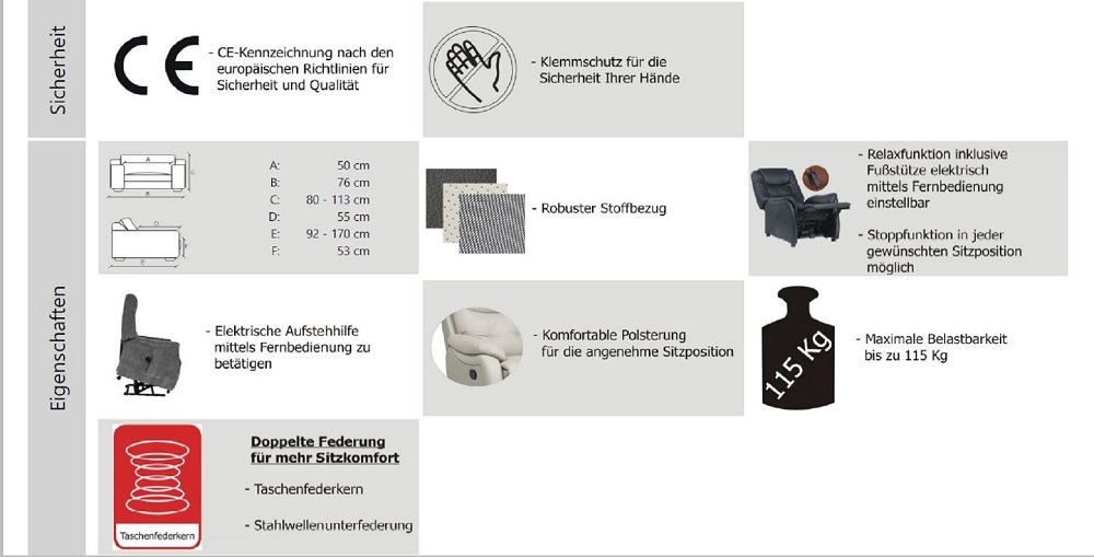 Der Fernsehsessel Bonnyville bietet maximalen Komfort im Sitzen und Liegen - so können Sie hier beispielsweise fernsehen, lesen oder sich einfach mal ein Stück zurücklehnen und entspannen. Dieser Komfort wird durch die doppelte Federung durch Taschenfederkern und Stahlwellenunterfederung in Kombination mit dem Komfortablen und robusten Polsterung herbeigeführt. Die Relax Funktion des Fernsehsessels Bonnyville wird Sie begeistern. Mit der beiliegenden Fernbedienung können Sie die Rückenlehne und Fußstütze durch einfaches Betätigen eines Knopfes in die gewünschte Sitzposition bringen. Die zusätzlich vorhandene Aufstehhilfe ist ebenfalls mittels Fernbedienung zu betätigen.