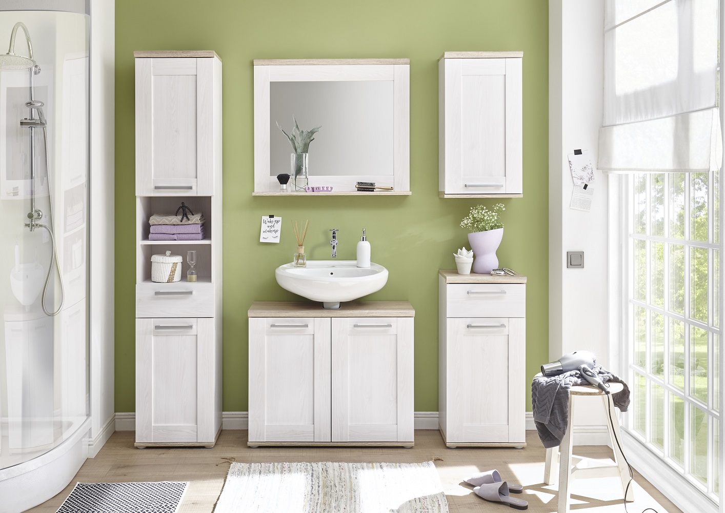 Mit dem Waschbeckenunterschrank aus der Möbelserie Romance erhalten sie ein tolles Möbelstück im klassichen Landhausstil. Seinen natürlichen und zeitlosen Look erhält der Waschbeckenunterschrank Romance durch weißes Sibiu Lärche Dekor mit einer dezenten, aber sichtbaren Holzmaserung. Die Absetzungen in San Remo hell liefern einen tollen Kontast und machen den klassichen Landhausstil komplett. Platz für Reinigungsmittel, Handtücher und weitere Badutensilien liefert der Stauraum hinter den beiden Türen. Stilvoll und funktional wird Sie der Waschbeckenunterschrank Romance begeistern!