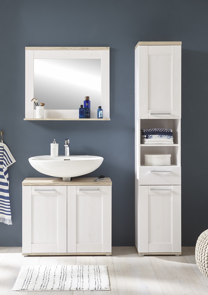 Funktionales Möbelstück im schicken Landhausstil!Mit dem Waschbeckenunterschrank aus der Möbelserie Romance erhalten sie ein tolles Möbelstück im klassichen Landhausstil. Seinen natürlichen und zeitlosen Look erhält der Waschbeckenunterschrank Romance durch weißes Sibiu Lärche Dekor mit einer dezenten, aber sichtbaren Holzmaserung. Die Absetzungen in San Remo hell liefern einen tollen Kontast und machen den klassichen Landhausstil komplett. Platz für Reinigungsmittel, Handtücher und weitere Badutensilien liefert der Stauraum hinter den beiden Türen. Stilvoll und funktional wird Sie der Waschbeckenunterschrank Romance begeistern!