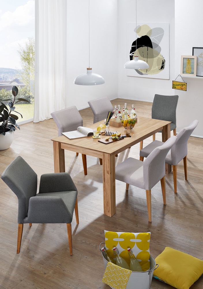 | Besonderheiten: | Schweizer Kante, Tischplatte: Stabverleimung - Holzlamellen aus Massivholz, inkl. Klappeinlage |