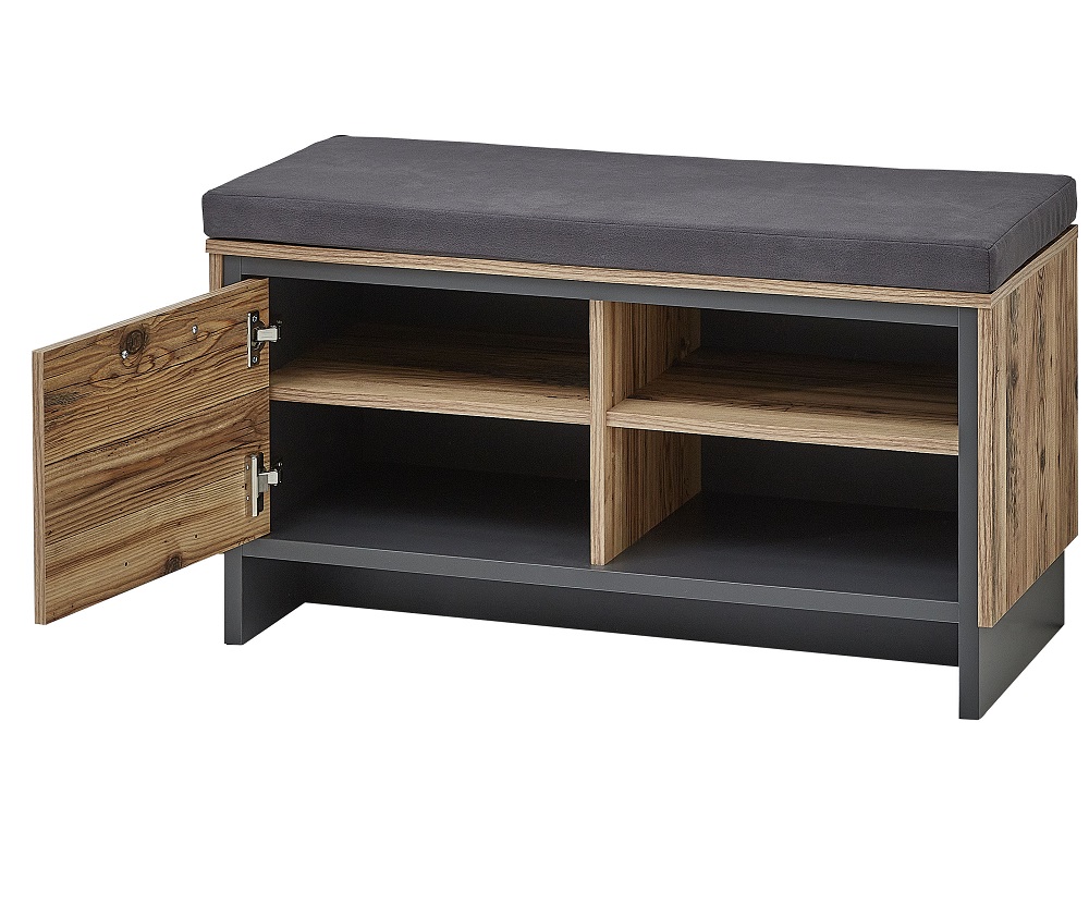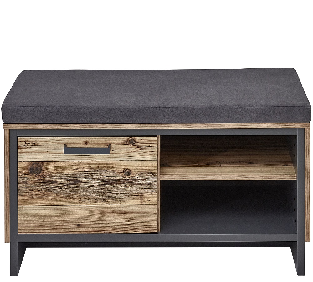 Die tolle und rustikale Garderobenbank aus der Möbelserie Prato bringt frischen Wind in Ihren Eingangsbereich. Der rustikale Stil und die wundervolle Farbgebung alpine Lodge und Graphit ist vielseitig einsetzbar und macht auch den kleinsten Flur zum echten Hingucker. Eine Klappe und zwei Fächer bietet Ihnen darüber hinaus Stauraum, um Ihre Schuhe oder kleine Accessoires perfekt verstauen zu können. Das Sitzen auf der Garderobenbank Prato wird durch ein kleines Sitzkissen angenehmer, perfekt für kleine Kinder. Holen Sie sich jetzt Ihre neue Garderobenbank Prato, und bereichern Sie Ihren Eingangsbereich.