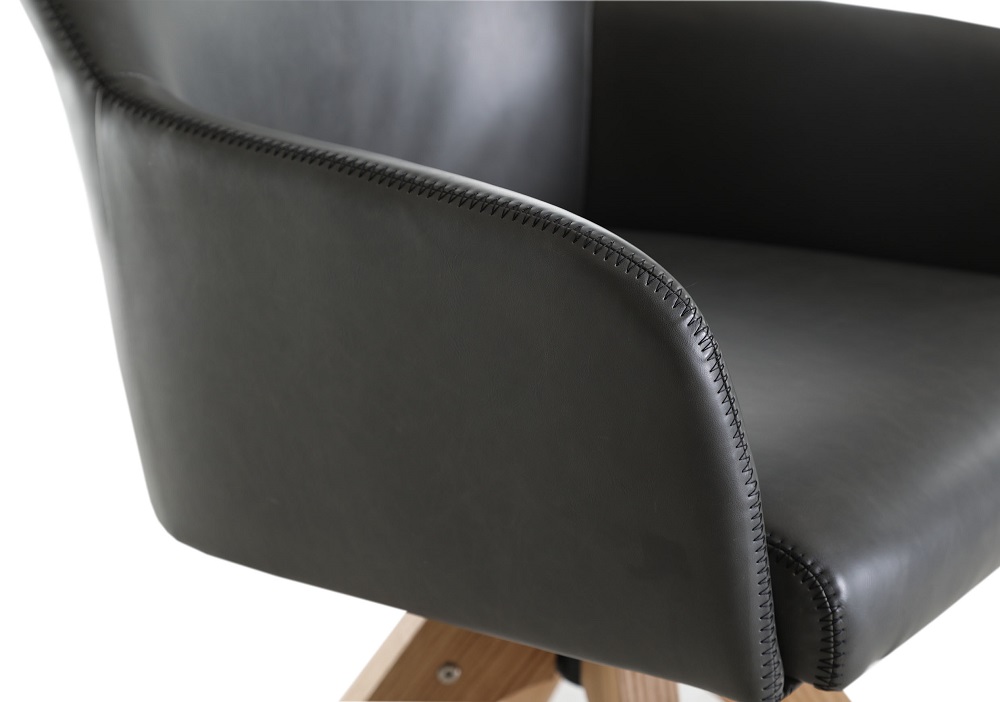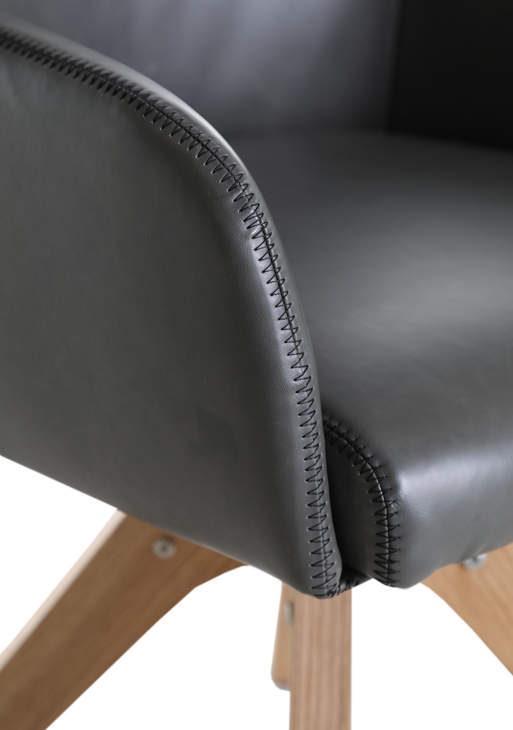 Hochwertig verarbeitet begeistert der Esszimmerstuhl Floyd als tolles Sitzmöbel für die Küche oder Ihr Esszimmer. Die gut gepolsterte Sitzschale bildet im Zusammenspiel mit der Rückenlehne und den beiden Armlehnen einen großartigen Sitzkomfort und liefert auch bei längerer Nutzung eine bequeme Sitzposition. Optisches Highlight und verantwortlich für sein markantes Design ist die moderne Zick-Zack-Naht die den Stuhl über die Armlehnen und Rückenlehne komplett umläuft. Der Bezug des Esszimmerstuhls Floyd besteht aus einem robusten Kunstleder und ist in den Farben grau und anthrazit erhältlich. Einen stabilen Stand sichert das Gestell aus echter, massiver Eiche und ist den Varianten Eiche Natur und Eiche schwarz lackiert erhältlich. Insgesamt stehen Ihnen bei dem 360° drehbaren Esszimmerstuhl Floyd somit vier Farbvarianten zu Verfügung, die sich problemlos in bereits vorhanden Einrichtungsstile integrieren lassen. Der Esszimmerstuhl Floyd ist eine tolle Bereicherung für Ihren Wohnraum und begeistert sowohl jung als auch alt.