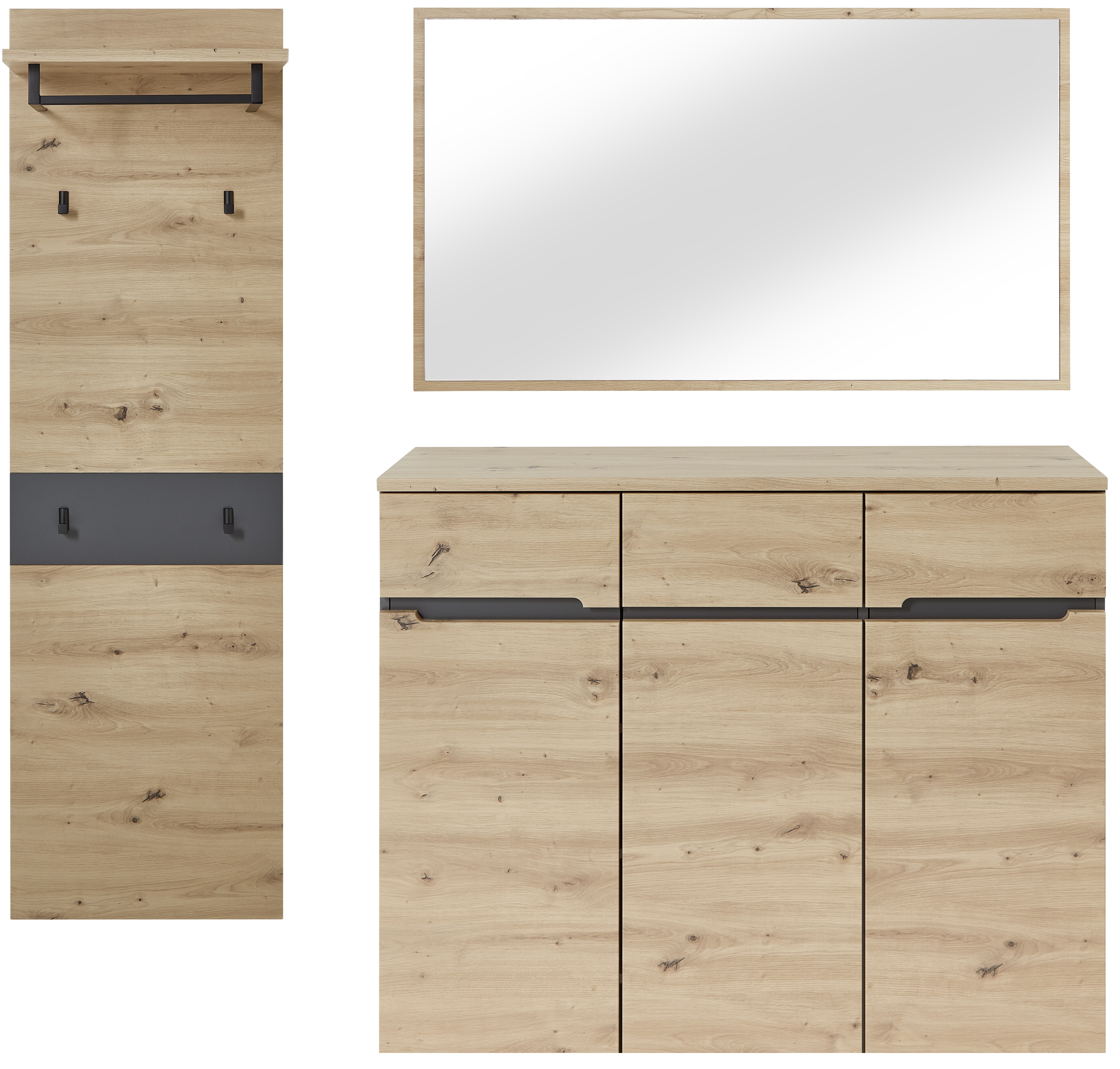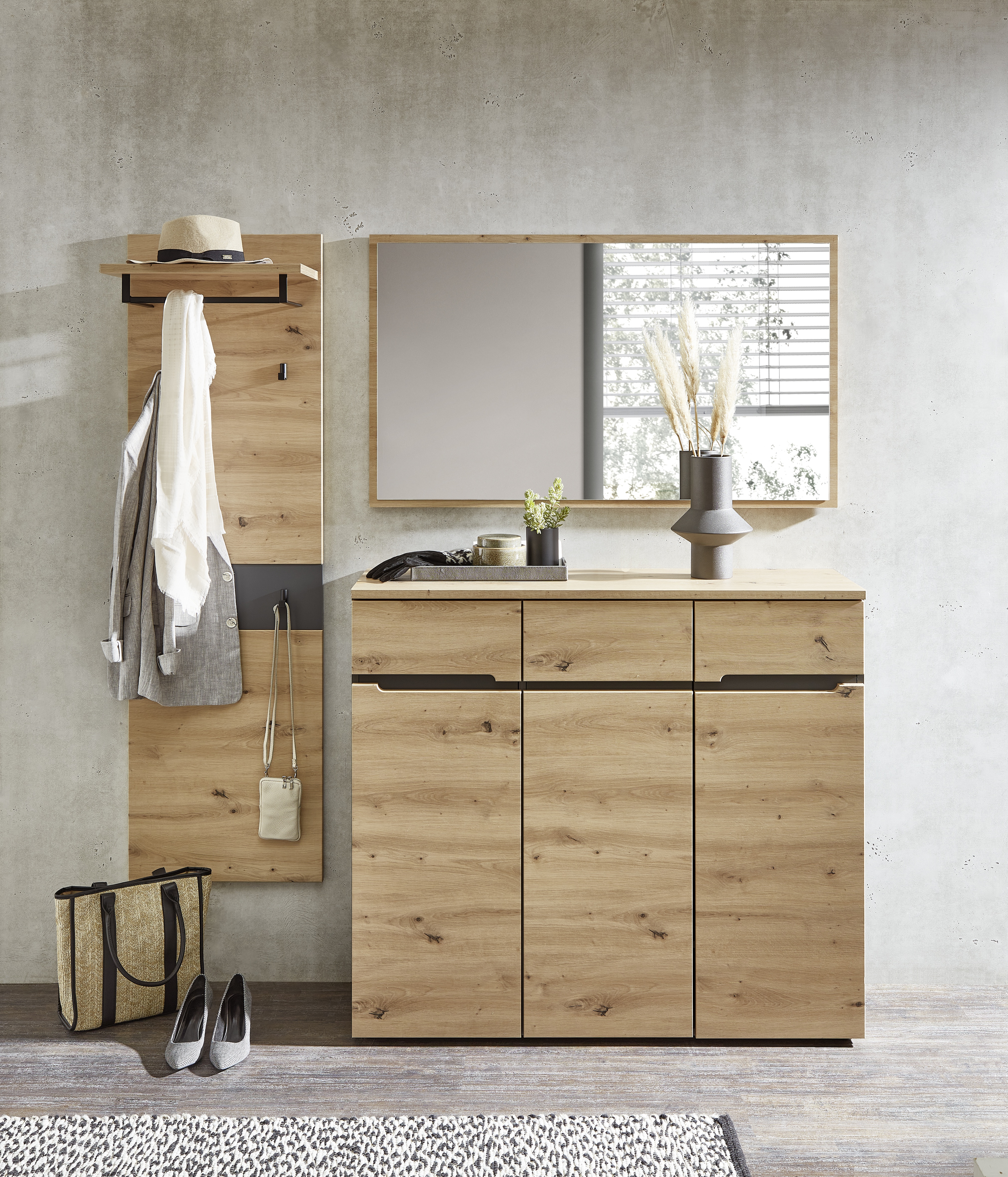 Das elegante Garderobenpaneel aus der Möbelserie Memphis bereichert Ihren Wohnbereich. Die tolle Farbgebung des Garderobenpaneels Artisan Eiche mit Graphit Absetzung macht es zu einem echten Hingucker. Durch die vier Garderobenhaken und der Ablage mit einer Kleiderstange bietet Ihnen das Garderobenpaneel Memphis ausreichend Platz um Ihre Jacken oder Kleidungsaccessoire aufhängen zu können. Holen Sie sich nun Ihr neues Garderobenpaneel, um Ihre Wohneinrichtung perfekt zu bereichern, und Ihren Alltag etwas einfacher zu gestalten!