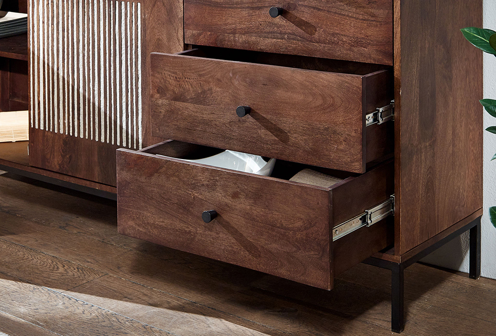 Die neue WZ-0564 Reihe beinhaltet ein wunderbares Retro TV-Element, dass sich wunderbar in Ihr Wohnbereich integrieren lässt. Die besondere Wahl des Materials Mangoholz und die unkonventionelle Lamellenstruktur, runden das TV-Element ab, und machen es damit zu einem schönen Blickfänger in Ihren Wohnbereich. Weiterhin bietet das TV-Element viel Platz um elektronische Geräte oder Ihre DVDs verstauen zu können. Des Weiteren kann man durch die große Ablagefläche nicht nur große Fernseher auf Ihnen platzieren, sondern auch verschiedene andere Dekorationen sowie Blumen oder Bilder Ihrer Liebsten.Hinweis für Massivholzmöbel:Bitte beachten Sie, dass Massivholz ein natürliches Material ist und daher einige Merkmale aufweisen kann, die seinen einzigartigen Charakter ausmachen. Massivholz kann Astlöcher, Wuchsrisse, Farbunterschiede und andere natürliche Merkmale aufweisen. Diese Unterschiede sind kein Grund zur Beanstandung, sondern zeugen von der Authentizität des Materials und verleihen jedem Möbelstück seinen individuellen Charme. Holz kann im Laufe der Zeit nachdunkeln oder aufgrund von Lichteinwirkung seine Farbe verändern. Diese Veränderungen sind normal und unterstreichen die natürliche Schönheit des Materials. Bitte zögern Sie nicht, wenden Sie sich bei Rückfragen gern an unseren Kundendienst.