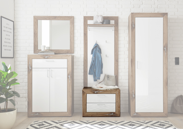 Garderobenbank Neapel in der Farbe Weiß und Oak Dunkel mit mehreren Schubkästen