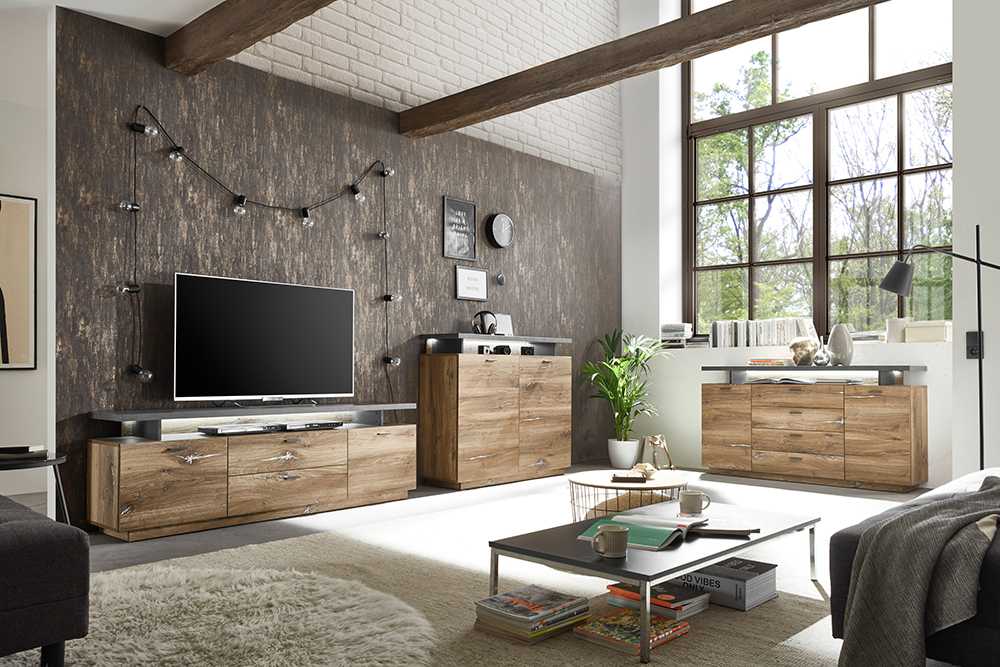 Das Lowboard Kingston ist einer der Artikel, die sich perfekt in moderne und zeitlose Wohnstile einfügt. Damit Sie auch alle Ihre technischen Geräte unterbekommen. Mit der integrierten Beleuchtung an der Rückwand hat man ein angenehmeres Wohngefühl bei Nacht. Das Lowboard bietet nebenher einen großen durch die beiden Schubläden und durch die beiden Seitenklappen Platz um weitere Konsumartikel von Ihnen unterbringen zu können.