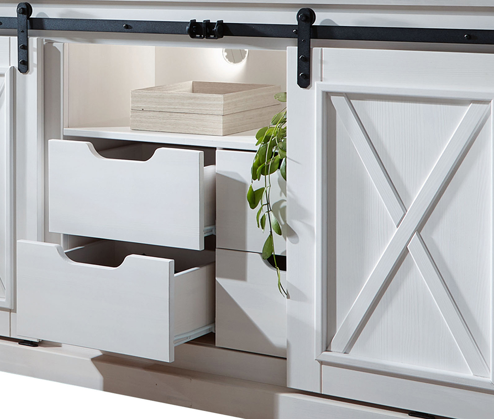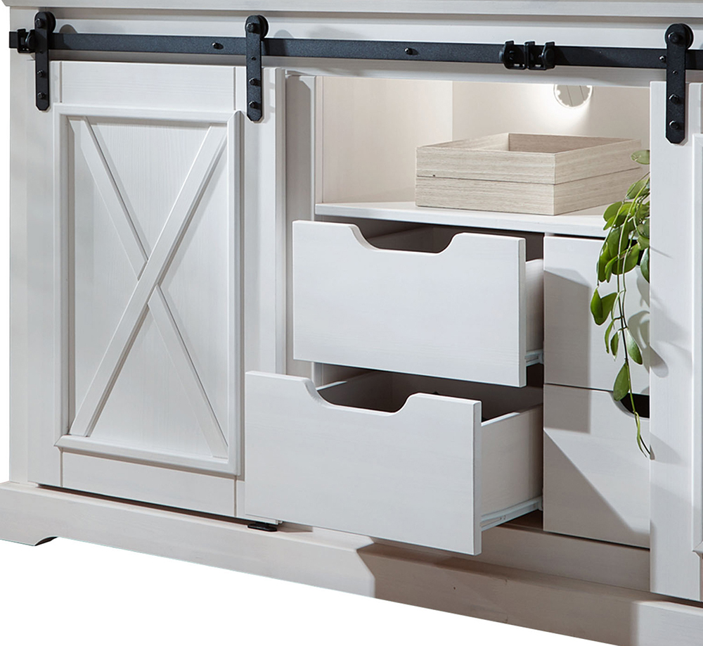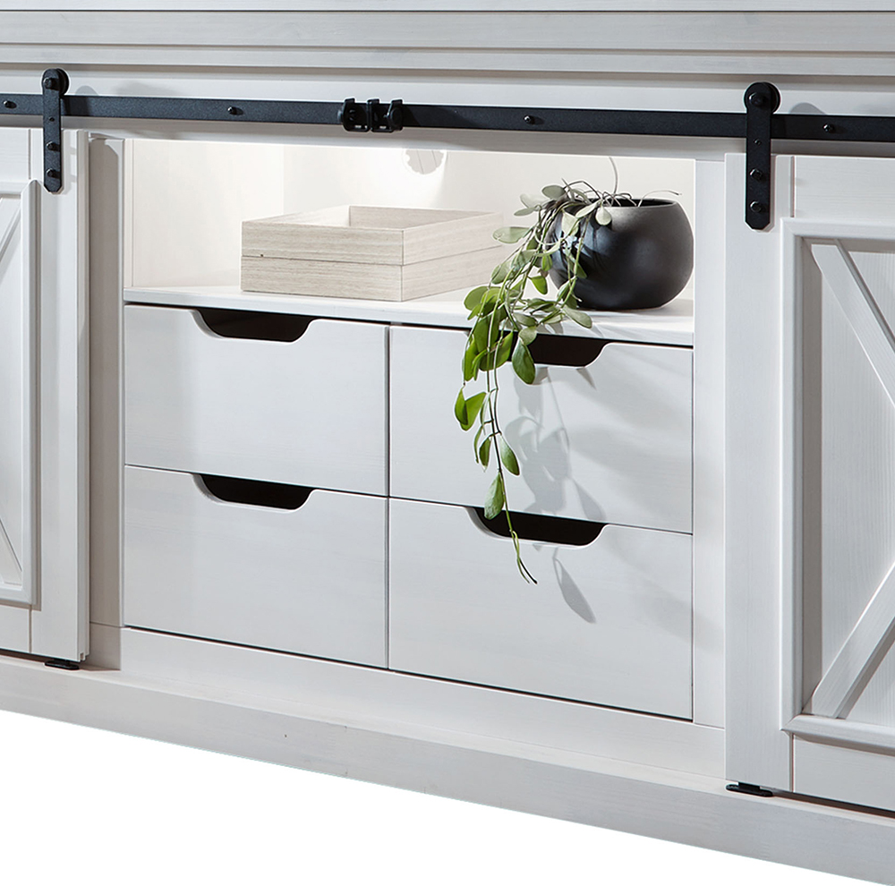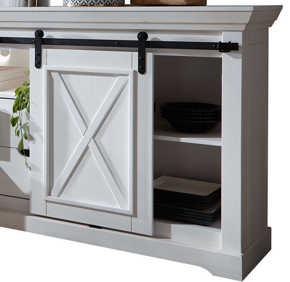 Das TV-Element II des WZ-0548 Programmes in der ungewöhnlichen Farbkombination Weiß gewachst und den schwarzen Metallelementen ist ein absoluter Muss für Ihren Wohnbereich, und bietet durch den modernen Landhausstil einen super Blickfang. Es eignet sich wunderbar dafür, Ihren großen Fernseher auf der Ablagefläche abstellen zu können. Die mittleren Ablageflächen bieten angenehm viel Platz, um Ihre Konsolen oder Ihren Blu-ray-Player abstellen zu können. Des Weiteren können Sie wunderbar Ihre Filme oder Serien links und rechts hinter den Schiebetüren verstauen, um auch diese immer in Nähe des Fernsehers zu haben.Hinweis für Massivholzmöbel:Bitte beachten Sie, dass Massivholz ein natürliches Material ist und daher einige Merkmale aufweisen kann, die seinen einzigartigen Charakter ausmachen. Massivholz kann Astlöcher, Wuchsrisse, Farbunterschiede und andere natürliche Merkmale aufweisen. Diese Unterschiede sind kein Grund zur Beanstandung, sondern zeugen von der Authentizität des Materials und verleihen jedem Möbelstück seinen individuellen Charme. Holz kann im Laufe der Zeit nachdunkeln oder aufgrund von Lichteinwirkung seine Farbe verändern. Diese Veränderungen sind normal und unterstreichen die natürliche Schönheit des Materials. Bitte zögern Sie nicht, wenden Sie sich bei Rückfragen gern an unseren Kundendienst.