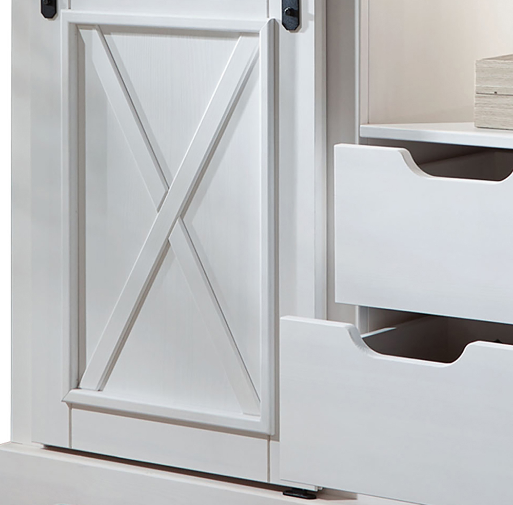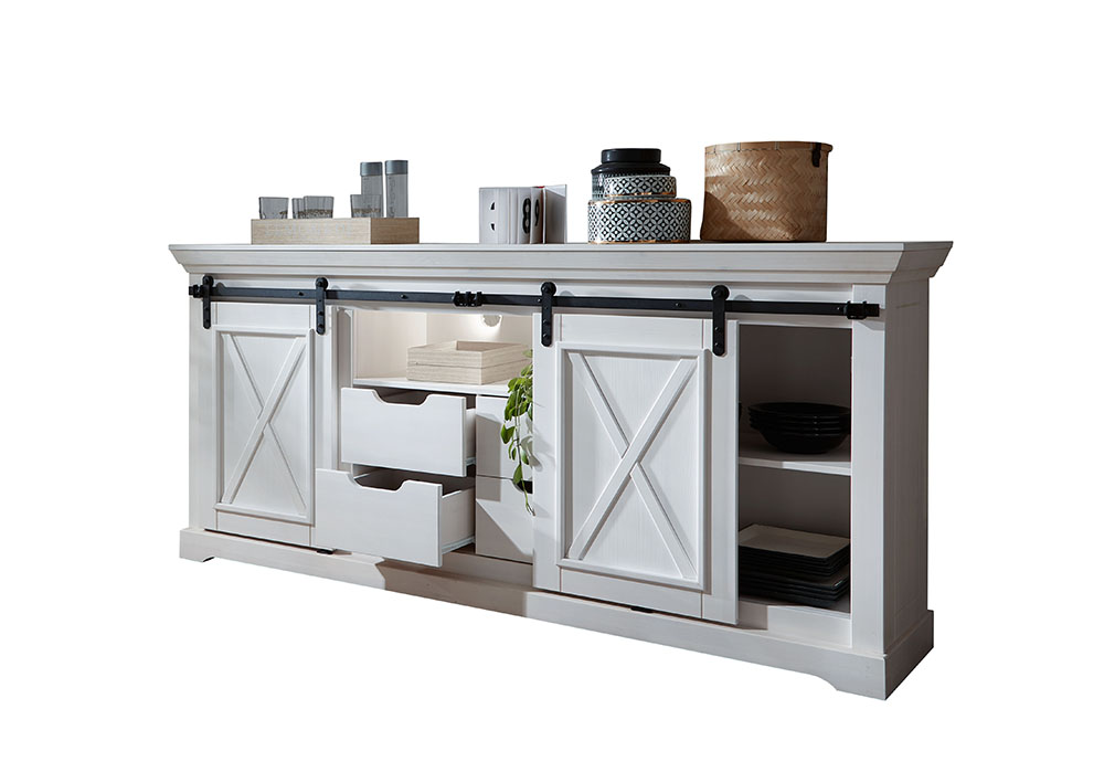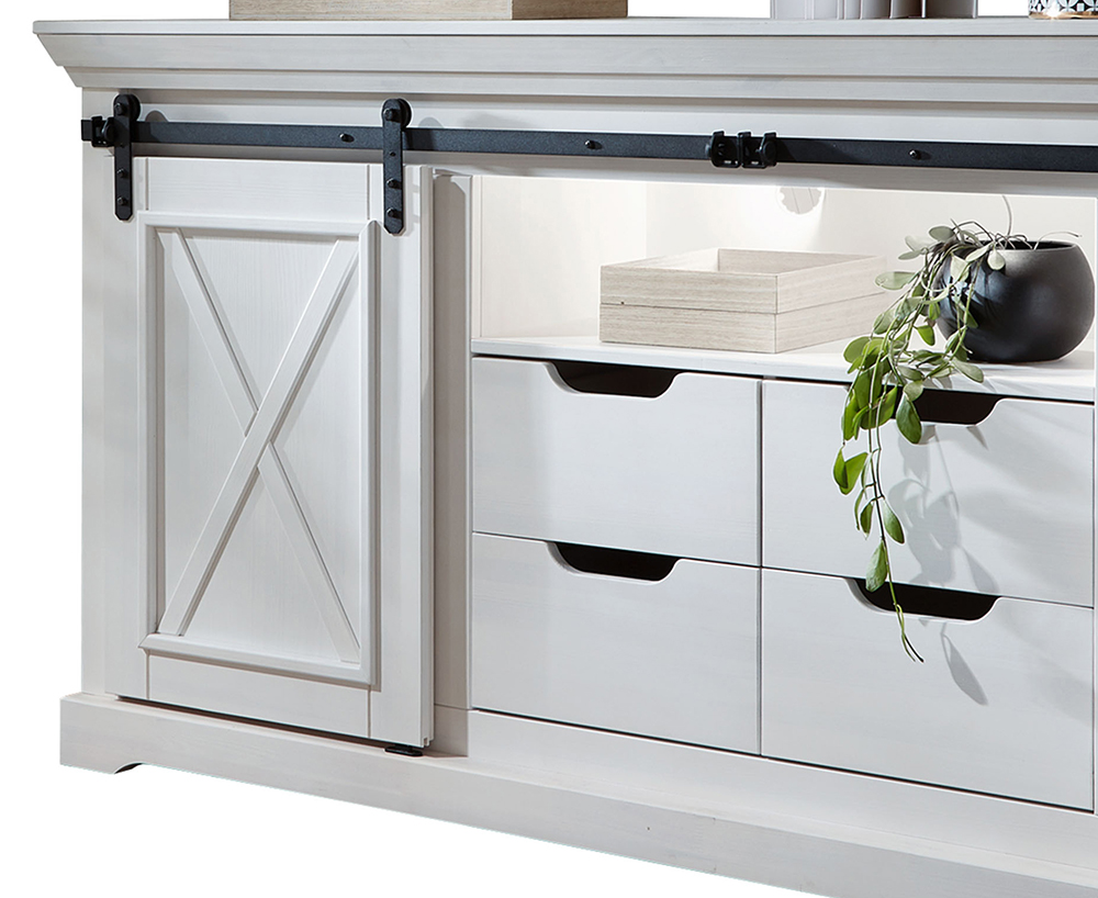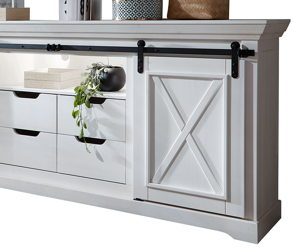 Das Highboard des WZ-0548 Programmes in der ungewöhnlichen Farbkombination Weiß gewachst und den schwarzen Metallelementen ist ein absoluter Muss für Ihren Wohnbereich, und bietet durch den modernen Landhausstil einen super Blickfang. Die mehreren großen Schubladen des Highboards sowie die mehreren Einlegeböden bieten eine Menge Platz für Ihre Dekorationen. In den offenen Fächern können Sie auch wunderbar platzsparend Ihre Bücher abstellen. Schön dabei ist auch, dass man wunderbar einer der beiden Seiten mit der Schiebetür verdecken kann.Hinweis für Massivholzmöbel:Bitte beachten Sie, dass Massivholz ein natürliches Material ist und daher einige Merkmale aufweisen kann, die seinen einzigartigen Charakter ausmachen. Massivholz kann Astlöcher, Wuchsrisse, Farbunterschiede und andere natürliche Merkmale aufweisen. Diese Unterschiede sind kein Grund zur Beanstandung, sondern zeugen von der Authentizität des Materials und verleihen jedem Möbelstück seinen individuellen Charme. Holz kann im Laufe der Zeit nachdunkeln oder aufgrund von Lichteinwirkung seine Farbe verändern. Diese Veränderungen sind normal und unterstreichen die natürliche Schönheit des Materials. Bitte zögern Sie nicht, wenden Sie sich bei Rückfragen gern an unseren Kundendienst.