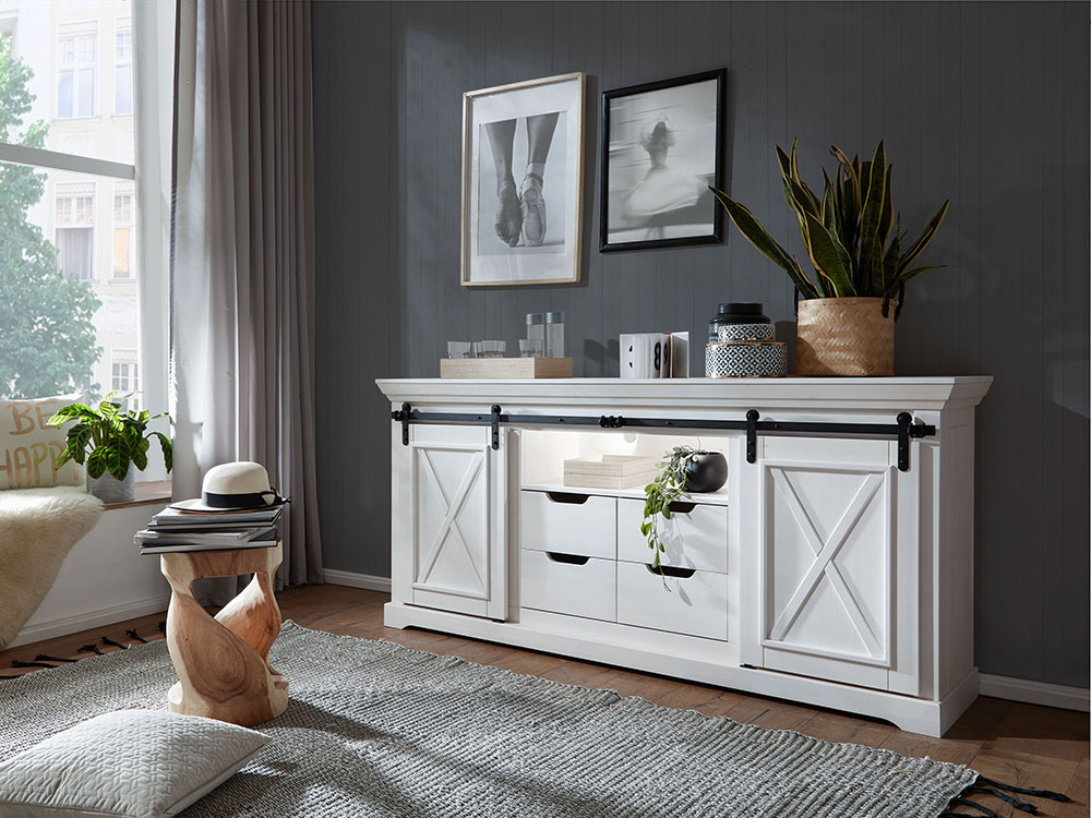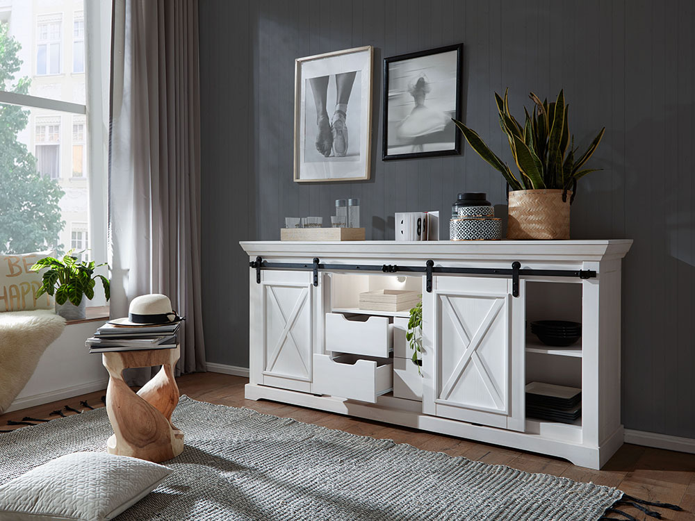 Das Sideboard I des WZ-0548 Programmes in der ungewöhnlichen Farbkombination Weiß gewachst und den schwarzen Metallelementen ist ein absoluter Muss für Ihren Wohnbereich, und bietet durch den modernen Landhausstil einen tollen Blickfang. Mit den drei Schubladen und den Einlegeböden Links und rechts bietet das Sideboard I genügend Stauraum, um Ihre Bücher oder Dekorationen verstauen zu können. Dabei sind die Einlegeböden links und rechts von Schiebetüren abgedeckt, und können wunderbar alles verdecken.Hinweis für Massivholzmöbel:Bitte beachten Sie, dass Massivholz ein natürliches Material ist und daher einige Merkmale aufweisen kann, die seinen einzigartigen Charakter ausmachen. Massivholz kann Astlöcher, Wuchsrisse, Farbunterschiede und andere natürliche Merkmale aufweisen. Diese Unterschiede sind kein Grund zur Beanstandung, sondern zeugen von der Authentizität des Materials und verleihen jedem Möbelstück seinen individuellen Charme. Holz kann im Laufe der Zeit nachdunkeln oder aufgrund von Lichteinwirkung seine Farbe verändern. Diese Veränderungen sind normal und unterstreichen die natürliche Schönheit des Materials. Bitte zögern Sie nicht, wenden Sie sich bei Rückfragen gern an unseren Kundendienst.