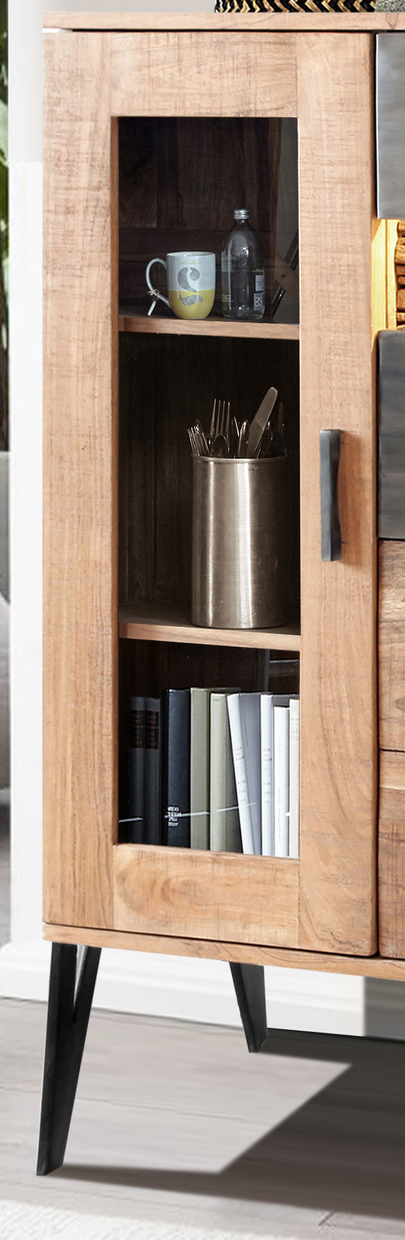 Das Highboard Hudson 2154 vereint rustikalen Stil und moderne Bauweise. Hergestellt aus robustem Holz und mit einem rustikalen Charme versehen, bringt dieses Highboard einen Hauch von Natürlichkeit in Ihr Zuhause. Mit den großen Ablageflächen und den Schubladen des Highboards Hudson 2154 bietet Ihnen nicht nur ausreichend Stauraum für Ihre Dekorationen, sondern bietet Ihnen auch einen echten Blickfang in Ihrem Wohnbereich! Verleihen Sie Ihrem Wohnraum mit dem Highboard Hudson 2154 eine warme und einladende Atmosphäre! Erleben Sie die perfekte Kombination aus Eleganz und Praktikabilität mit dem zeitlosen Highboard Hudson 2154, das sowohl Ihren Dekorations- als auch Ihren Stauraumbedürfnissen gerecht wird.Hinweis für Massivholzmöbel:Bitte beachten Sie, dass Massivholz ein natürliches Material ist und daher einige Merkmale aufweisen kann, die seinen einzigartigen Charakter ausmachen. Massivholz kann Astlöcher, Wuchsrisse, Farbunterschiede und andere natürliche Merkmale aufweisen. Diese Unterschiede sind kein Grund zur Beanstandung, sondern zeugen von der Authentizität des Materials und verleihen jedem Möbelstück seinen individuellen Charme. Holz kann im Laufe der Zeit nachdunkeln oder aufgrund von Lichteinwirkung seine Farbe verändern. Diese Veränderungen sind normal und unterstreichen die natürliche Schönheit des Materials. Bitte zögern Sie nicht, wenden Sie sich bei Rückfragen gern an unseren Kundendienst.