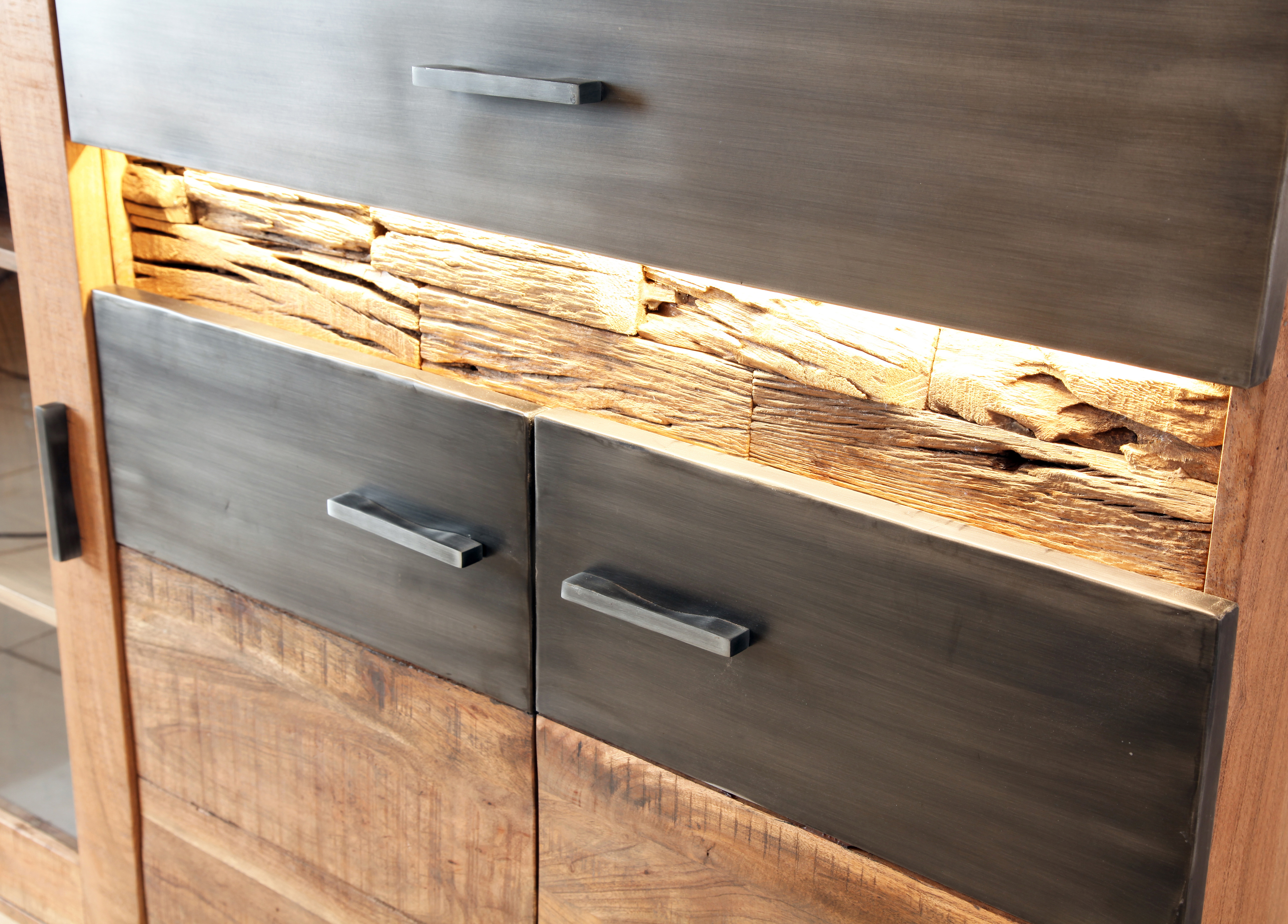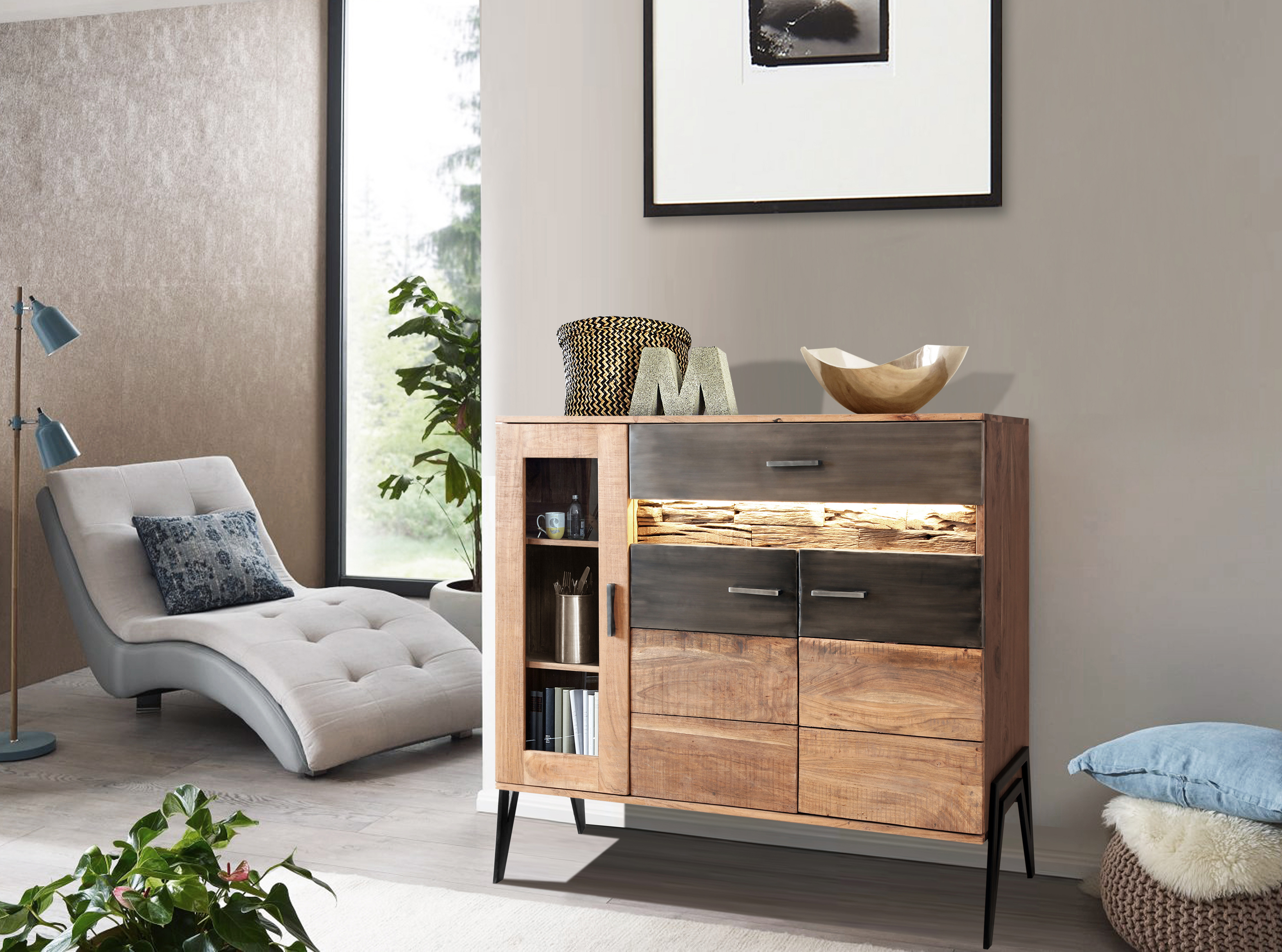 Entdecken Sie das Lowboard Hudson 2156. Der rustikale Charme trifft auf moderne Bauweise! Die markante Holzoptik des Lowboard Hudson 2156 schafft eine warme Atmosphäre, während die integrierte Beleuchtung Ihre Dekorationen gekonnt in Szene setzt. Mit reichlich Stauraum dank mehrerer Türen und Schubladen bietet Ihnen das Lowboard Hudson 2156 nicht nur einen Blickfang, sondern ist auch äußerst praktisch. Verschönern Sie Ihr Zuhause mit diesem zeitlosen Lowboard Hudson 2156!Hinweis für Massivholzmöbel:Bitte beachten Sie, dass Massivholz ein natürliches Material ist und daher einige Merkmale aufweisen kann, die seinen einzigartigen Charakter ausmachen. Massivholz kann Astlöcher, Wuchsrisse, Farbunterschiede und andere natürliche Merkmale aufweisen. Diese Unterschiede sind kein Grund zur Beanstandung, sondern zeugen von der Authentizität des Materials und verleihen jedem Möbelstück seinen individuellen Charme. Holz kann im Laufe der Zeit nachdunkeln oder aufgrund von Lichteinwirkung seine Farbe verändern. Diese Veränderungen sind normal und unterstreichen die natürliche Schönheit des Materials. Bitte zögern Sie nicht, wenden Sie sich bei Rückfragen gern an unseren Kundendienst.