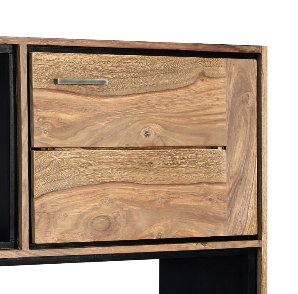 Mit dem Schreibtisch Bandung erhalten Sie einen echten Hingucker für Ihren Arbeitsbereich. Die Vollholzplatte bietet Ihnen großen Platz um Ihre Dokumente bearbeiten oder ablegen zu können. Mit der Farbkombination Sheesham und Schwarz ist der Schreibtisch ein wahrer Hingucker, und bietet damit ein modernen, dennoch rustikalen Stil. Entsprechend ist der Schreibtisch Bandung ein besonderes Möbelstück. Holen Sie sich jetzt den Schreibtisch für Ihren Arbeitsbereich!Hinweis für Massivholzmöbel:Bitte beachten Sie, dass Massivholz ein natürliches Material ist und daher einige Merkmale aufweisen kann, die seinen einzigartigen Charakter ausmachen. Massivholz kann Astlöcher, Wuchsrisse, Farbunterschiede und andere natürliche Merkmale aufweisen. Diese Unterschiede sind kein Grund zur Beanstandung, sondern zeugen von der Authentizität des Materials und verleihen jedem Möbelstück seinen individuellen Charme. Holz kann im Laufe der Zeit nachdunkeln oder aufgrund von Lichteinwirkung seine Farbe verändern. Diese Veränderungen sind normal und unterstreichen die natürliche Schönheit des Materials. Bitte zögern Sie nicht, wenden Sie sich bei Rückfragen gern an unseren Kundendienst.