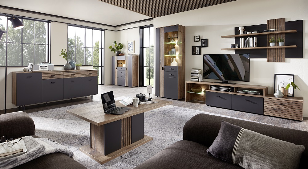Wohnlösung Linea Farbe Cosmos Grey Flaggstaff Oak inklusive Beleuchtung