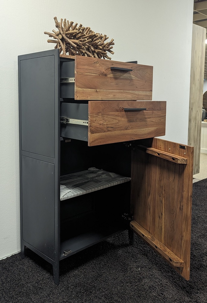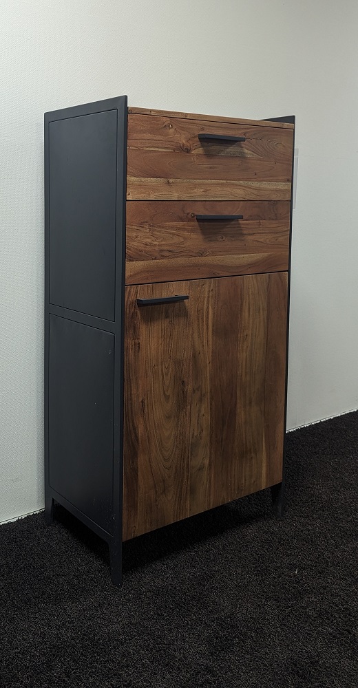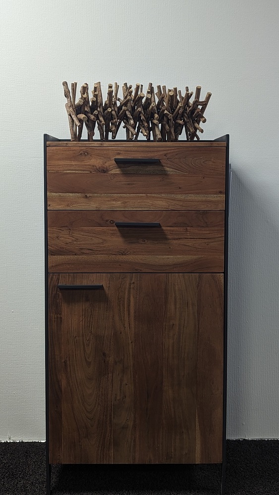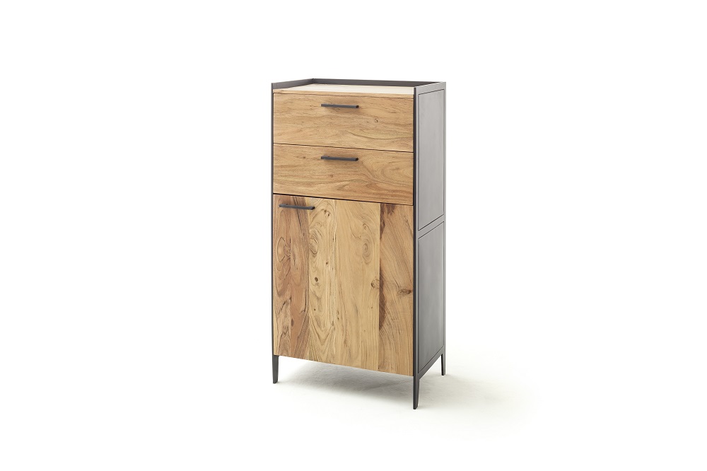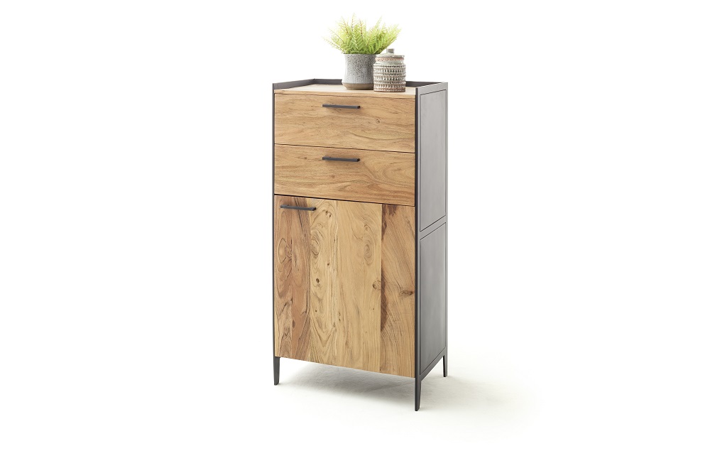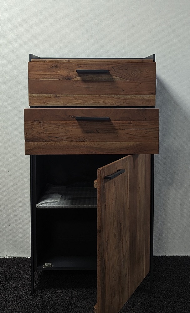 | Besonderheiten: | Deckplatte und Front: Akazie Massiv, Innen: Holzwerkstoff, Korpus außen: Metall |
