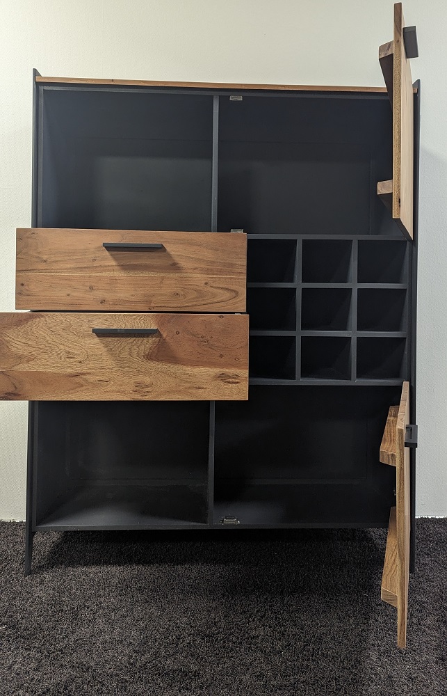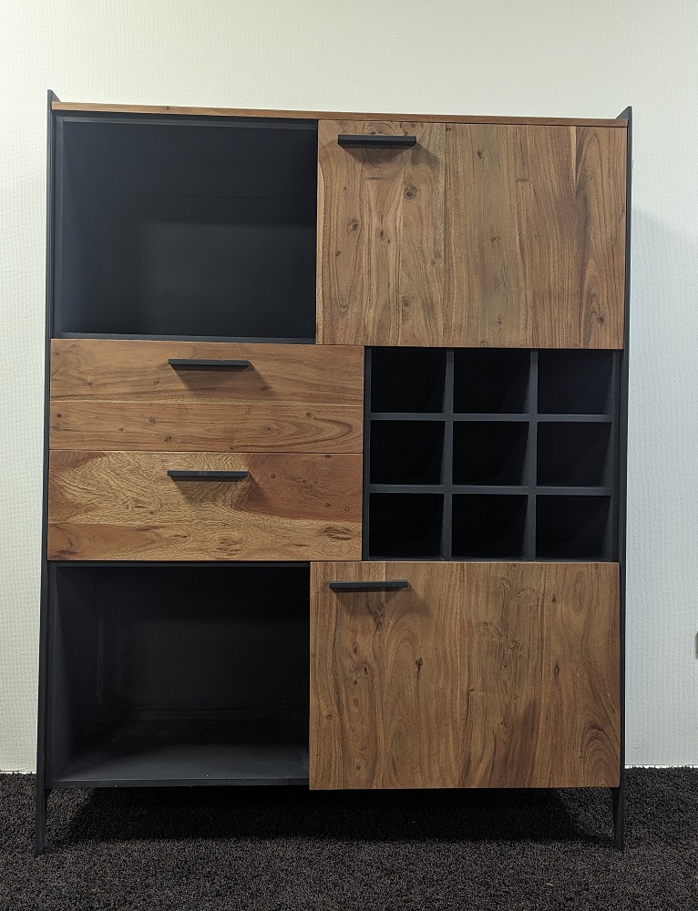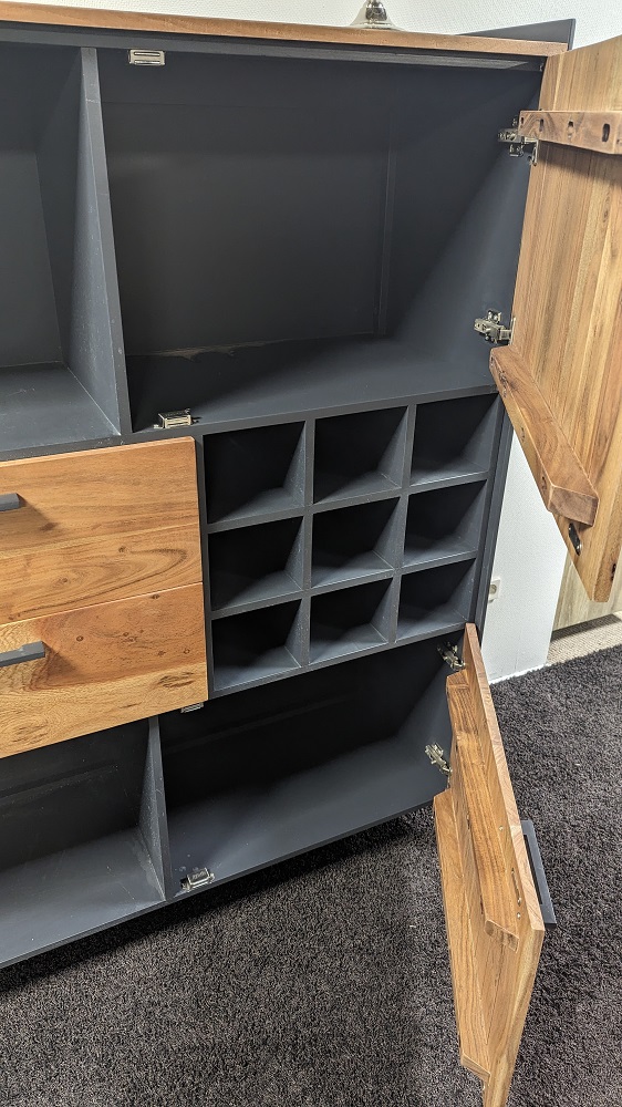 | Besonderheiten: | 9 Fächer für Weinflaschen, Deckplatte und Front: Akazie Massiv, Innen: Holzwerkstoff, Korpus außen: Metall |