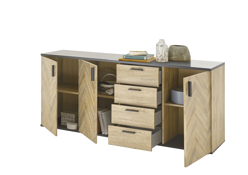 Mit der modernen Kommode III der Serie Sevilla holen Sie sich ein Möbelstück mit einem wundervollen Design in Ihr Haus. Die Kommode III Sevilla kommt mit einer besonderen Farbkombination in Eiche und Grau. Das macht die Kommode III Sevilla zu einem Möbelstück, das nahezu in jede Inneneinrichtung passt. Weiterhin bietet die Kommode III Sevilla reichlich Stauraum zur Unterbringung von den unterschiedlichsten Gegenständen. Dabei können Sie auch kleinere Gegenstände wunderbar in einer der 4 Schubkästen unterbringen. Mit der modernen Optik und dem großen Stauraum eignet sich die Kommode III Sevilla auch wunderbar zur Unterbringung von Akten in Büroräumen, und macht dabei einen tollen Eindruck.
