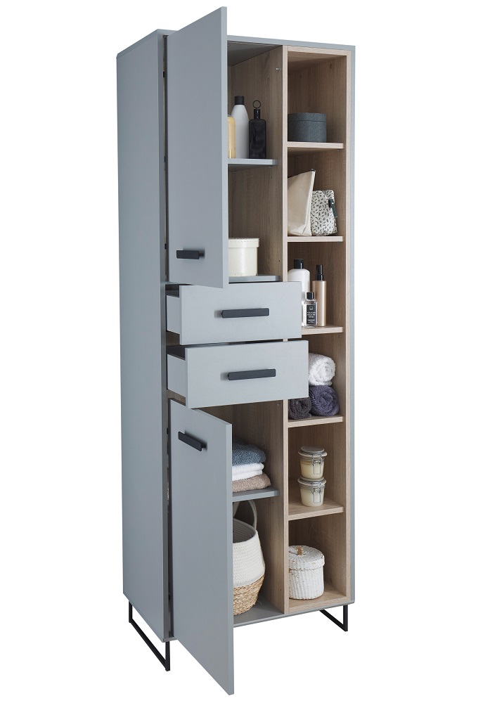 Im Badezimmer macht der Hochschrank Tunis optisch eine tolle Figur. Zwei große Türen, zwei Schubkästen bietet er Raum zum Verstauen von Bad-Utensilien oder Stapeln von Handtüchern. Mit gewollt schlanken und begrenzten Ausmaßen eignet er sich als Funktionsmöbel im räumlich begrenzten Bad. Durch seine vielfältigen Lagerungsmöglichkeiten lässt sich der persönliche Bad-Bereich modern in Szene setzen.