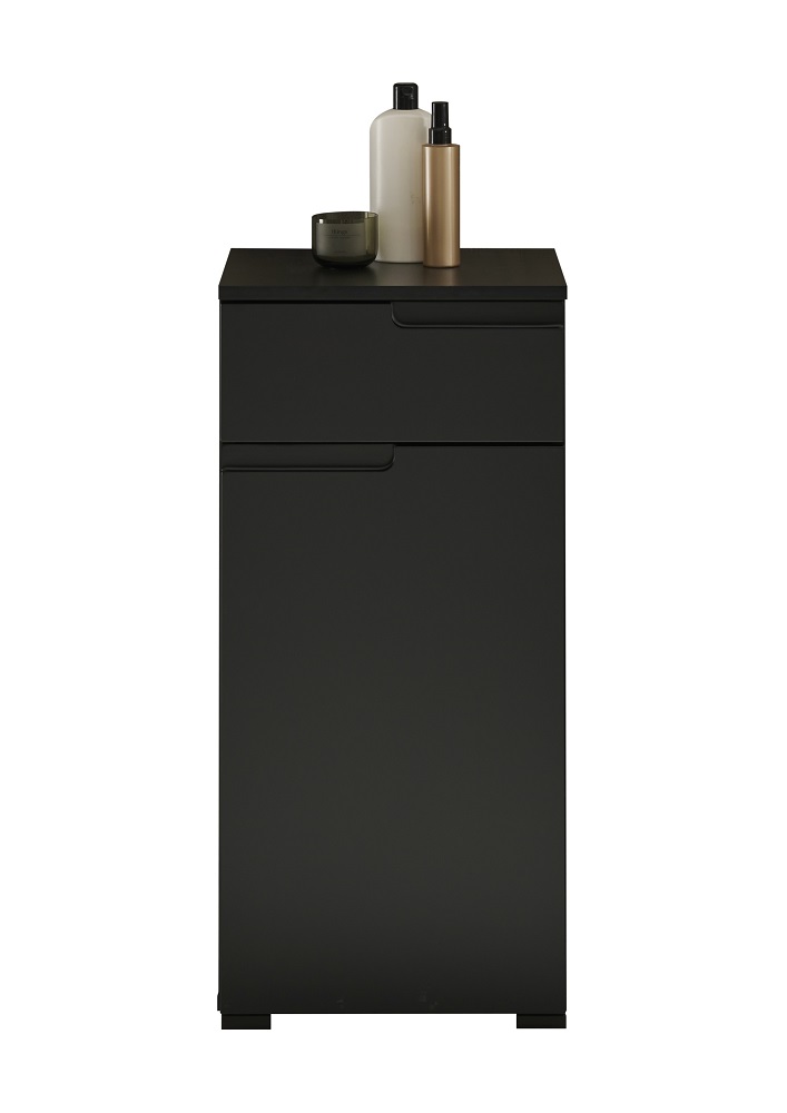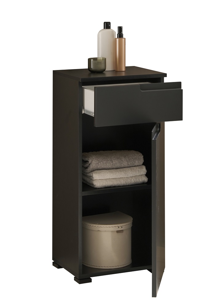 Die moderne Badmöbel-Reihe Spice ist optisch, mit seiner Farbgebung ein schöner und eleganter Begleiter für Ihre Badbereiche. Mit der optischen Farbgebung Schwarz matt und der modern eingelassenen Griffe, holen Sie sich mit der Reihe Spice eine tolle Badmöbel-Serie in Ihren Wohnbereich. Auch sehr platzsparend ist die Badmöbel Serie Spice und eignet sich deshalb auch wunderbar für kleinere Badezimmer oder Gästetoiletten. Besonders der Hochschrank bietet großen Stauraum für diverse Pflegeprodukte und Handbücher. Kleinere Objekte lassen sich auch sehr gut in den dem Schubkasten verstauen. Holen Sie sich jetzt den Hochschrank der Badserie Spice!