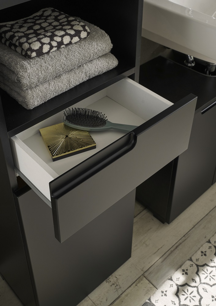 Die moderne Badmöbel-Reihe Spice ist optisch, mit seiner Farbgebung ein schöner und eleganter Begleiter für Ihre Badbereiche. Mit der optischen Farbgebung Schwarz matt und der modern eingelassenen Griffe, holen Sie sich mit der Reihe Spice eine tolle Badmöbel-Serie in Ihren Wohnbereich. Auch sehr platzsparend ist die Badmöbel Serie Spice und eignet sich deshalb auch wunderbar für kleinere Badezimmer oder Gästetoiletten. Besonders die Kommode der Badmöbel Serie Spice bietet ausreichend Platz, um Handtücher oder Badetücher perfekt unterzubringen. Kleinere Lappen oder Badeutensilien können Sie auch wunderbar in dem Schubkasten verstauen. Holen Sie sich jetzt die Kommode aus der Badmöbel Reihe Spice!