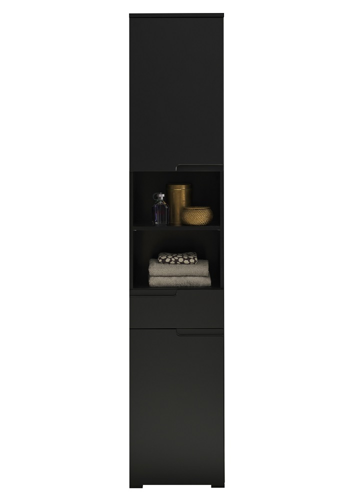 Die moderne Badmöbel-Reihe Spice ist optisch, mit seiner Farbgebung ein schöner und eleganter Begleiter für Ihre Badbereiche. Mit der optischen Farbgebung Schwarz matt und der modern eingelassenen Griffe, holen Sie sich mit der Reihe Spice eine tolle Badmöbel-Serie in Ihren Wohnbereich. Auch sehr platzsparend ist die Badmöbel Serie Spice und eignet sich deshalb auch wunderbar für kleinere Badezimmer oder Gästetoiletten. Besonders das Highboard bietet großen Stauraum für diverse Pflegeprodukte und Handbücher. Kleinere Objekte lassen sich auch sehr gut in den 3 Schubkästen verstauen. Holen Sie sich jetzt das Highboard der Badmöbel-Reihe Spice!