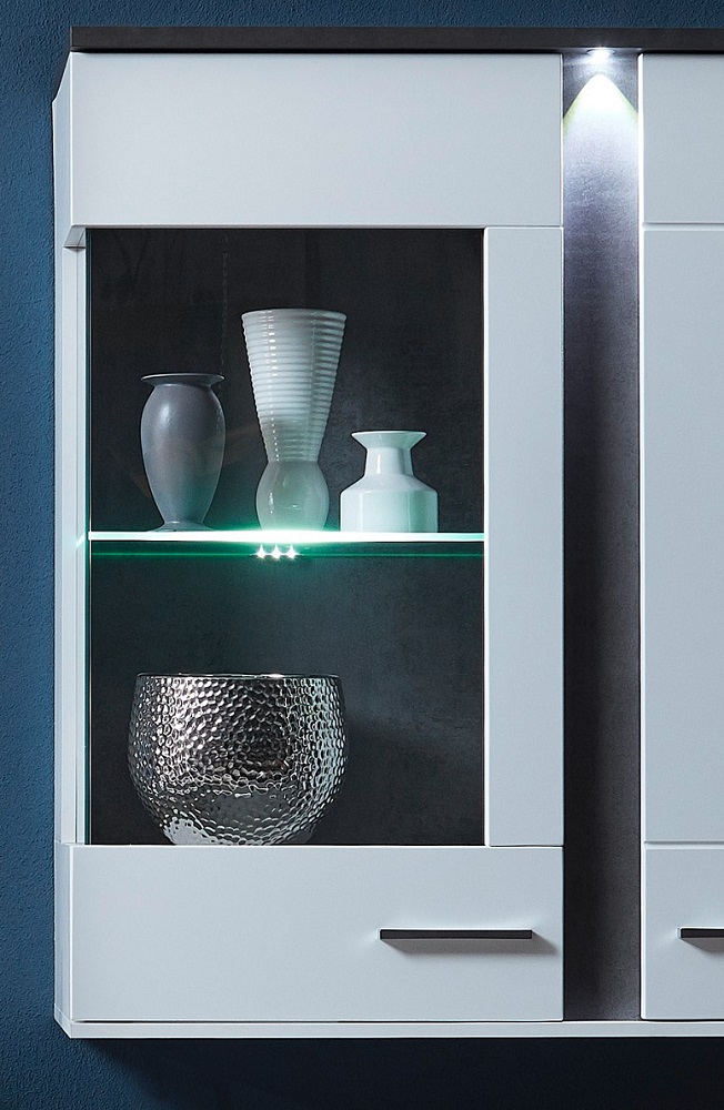 Die moderne Aufsatz-Vitrine Spurt bietet Ihnen eine perfekte Kombination aus Design und praktischen Stauraum für Ihren Wohnbereich. Sie können die Aufsatz-Vitrine Spurt perfekt mit Ihren vorhandenen Wohnmöbeln kombinieren, da sich die Aufsatz-Vitrine durch die tolle Farbgebung Weiß und Betonoxid perfekt einbringen lässt. Dank der großen Glaselemente in der Front und an der Seite können Sie Ihre Dekorationen wie Bilder von Ihren Liebsten oder kleine Andenken perfekt zur Show stellen. Durch die LEDs der Aufsatz-Vitrine und der Glasböden werden diese perfekt untermalt. Holen Sie sich jetzt Ihre Aufsatz-Vitrine Spurt, und bereichern Sie Ihren Alltag!Achtung: Bei der Aufsatz-Vitrine Spurt 10E9WT03 handelt es sich um eine direkte Vitrine zum Aufsetzen von vorhandenen Wohnwänden. Die Aufsatz-Vitrine ist für den Gebrauch auf der linken Seite der Anbauwand vorgesehen!