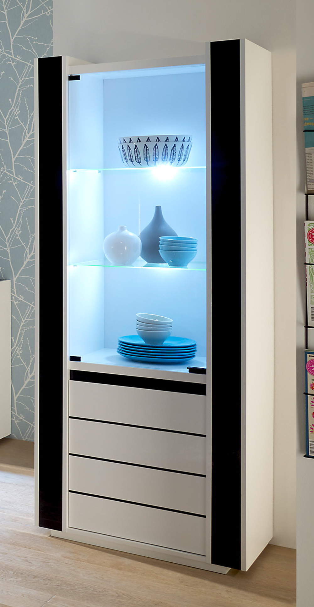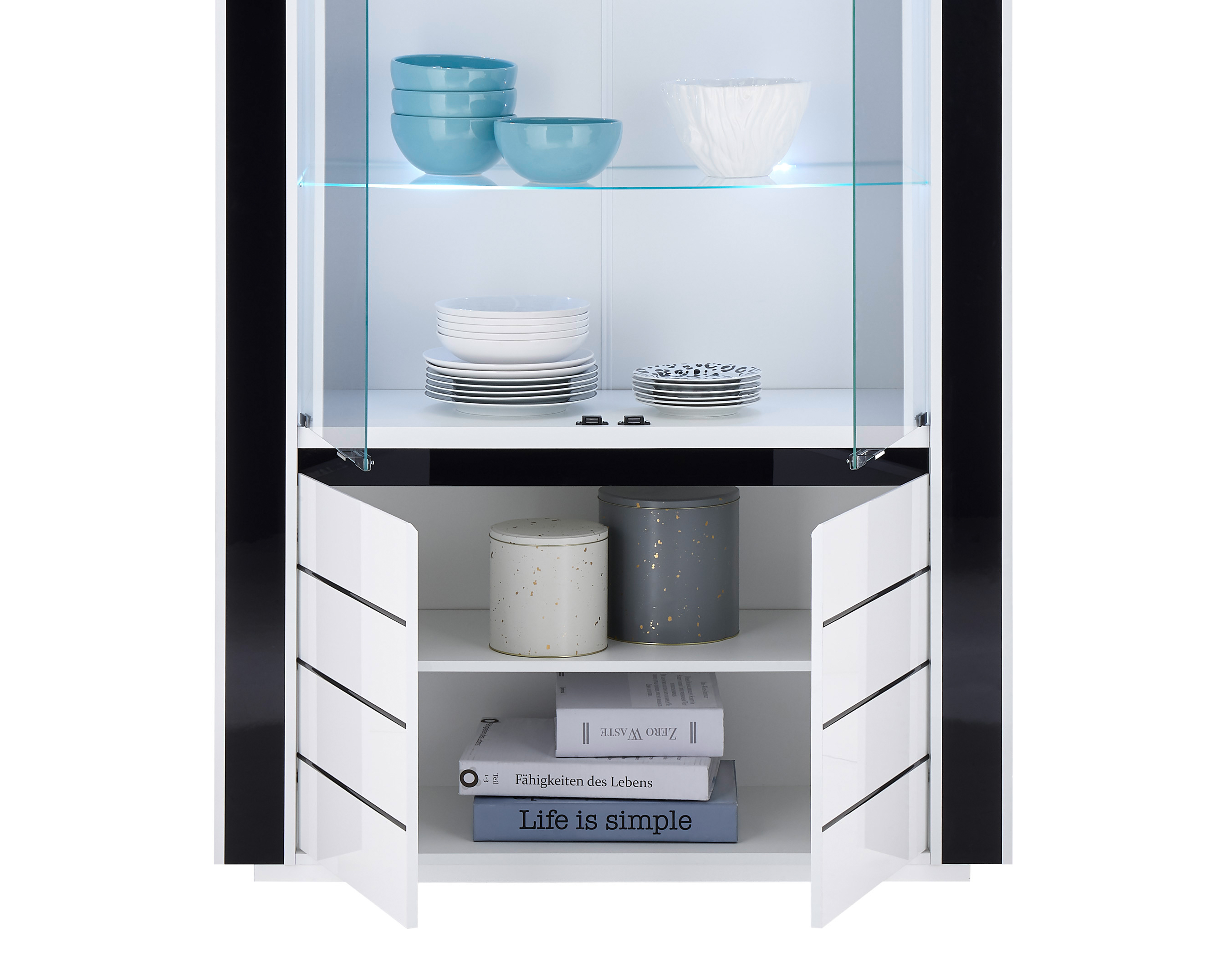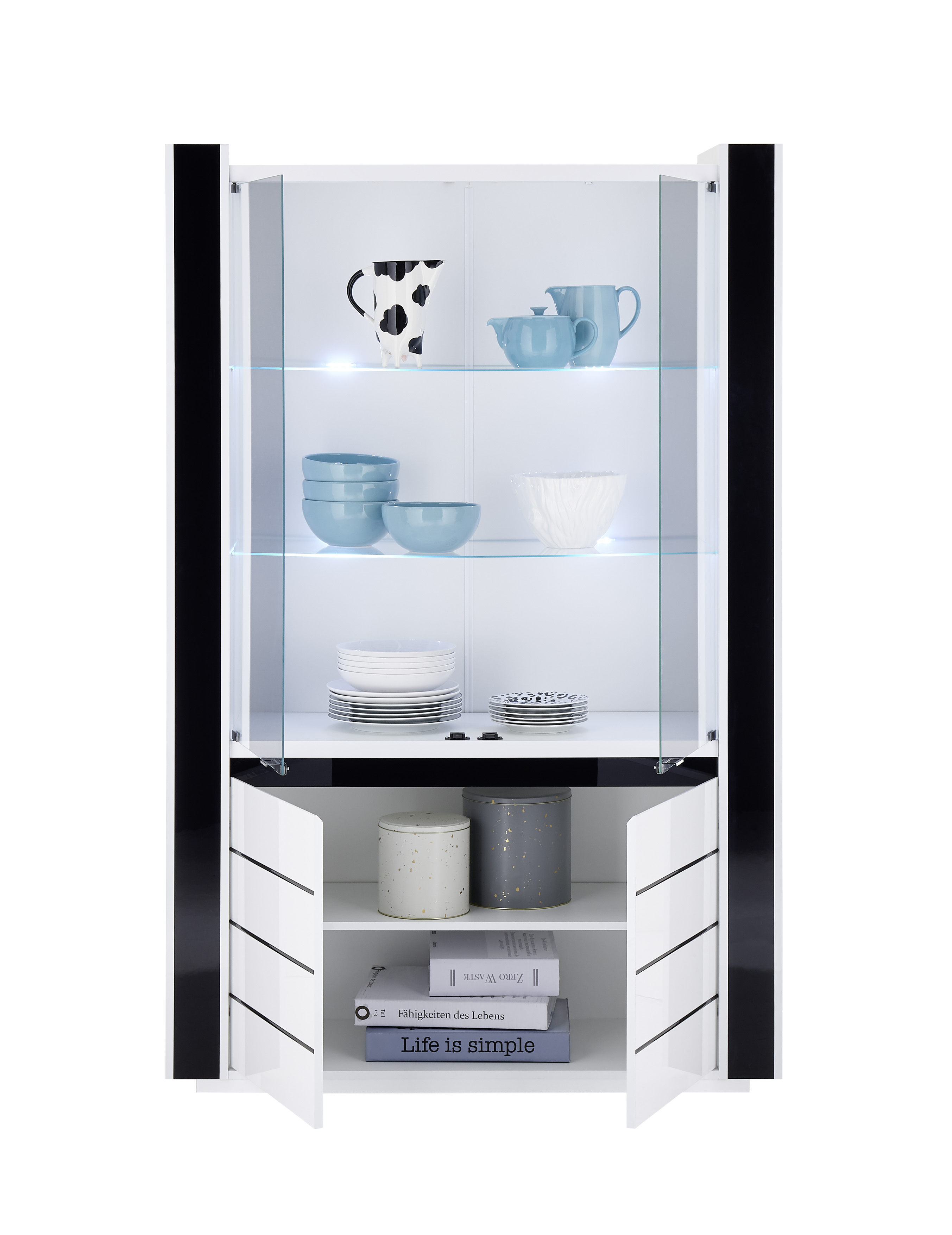 Entdecken Sie die zeitlose Eleganz und praktische Raffinesse unserer Vitrine Savona. Mit einem edlen Mix aus klassischem Weiß oder tiefem Schwarz, passt sie die Vitrine Savona perfekt in ihren modernen Wohnraum. Die großzügigen Maße von ca. 73 cm Breite, 185 cm Höhe und 45 cm Tiefe bieten ausreichend Platz für Ihre Bilder oder Accessoirs Ihrer Liebsten. Dank der 2 Türen und 4 Einlegeböden haben Sie eine vielfältige Möglichkeit zur Präsentation. Und mit der integrierten Beleuchtung setzen Sie Ihre Sammlung gekonnt in Szene. Gönnen Sie sich den Luxus von der Vitrine Savona!