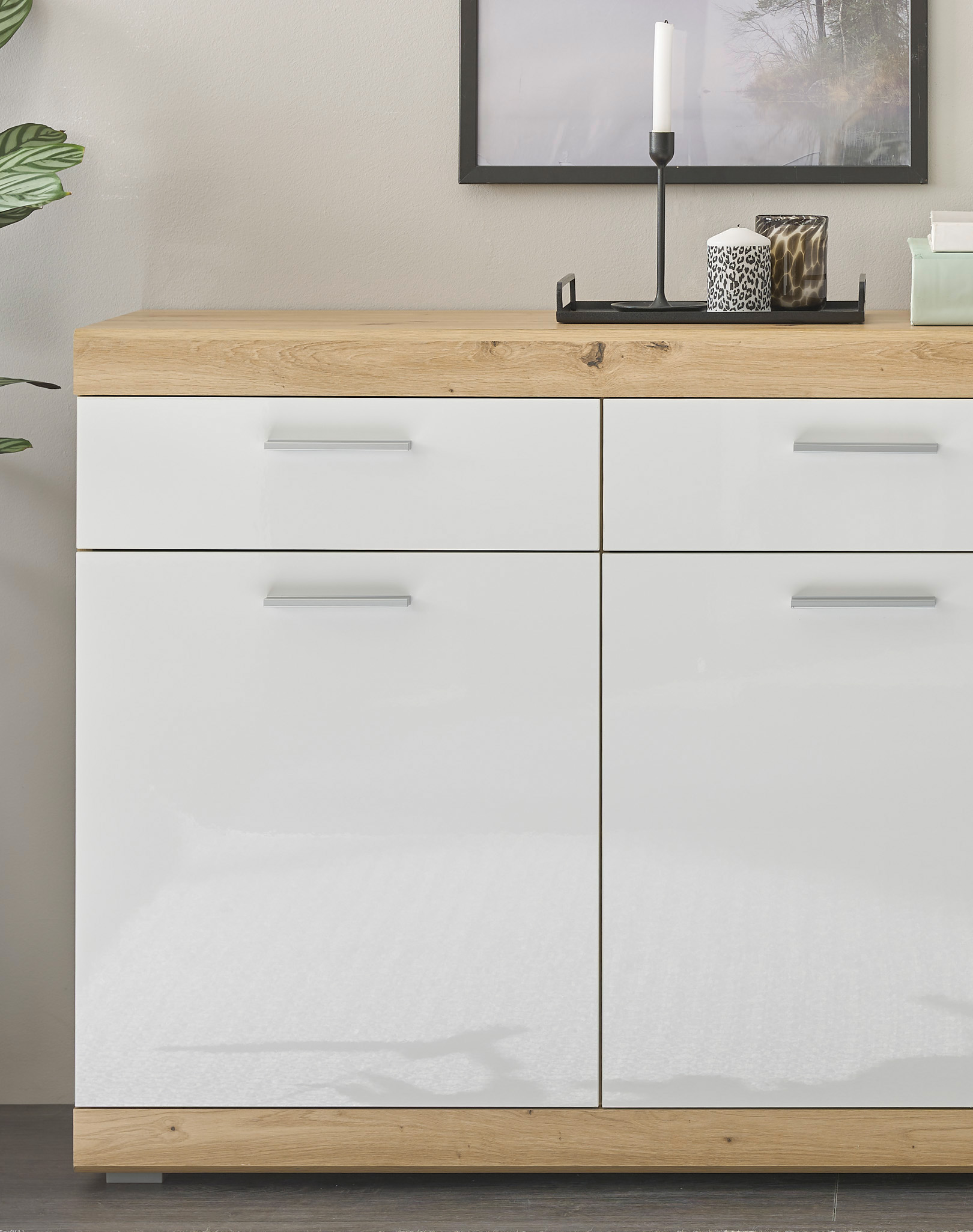 Entdecken Sie mit der stilvollen Kommode Nola die Möglichkeit, Ihr Zuhause durch die tolle Farbkombination und dem großen Stauraum zu bereichern. Mit dem zeitlosen Design der Kommode Nola bietet Ihnen diese eine harmonische Kombination aus Weiß und Eiche. Die Kommode Nola verleiht Ihnen in jedem Raum eine elegante Note. Dank der großzügigen Schublade bietet Ihnen die Kommode Nola nicht nur eine ansprechende ßsthetik, sondern auch praktischen Stauraum für Ihre Dekorationen. Auch hinter den beiden Türen bietet Ihnen die Kommode Nola eine Menge Platz um auch große Dekorationen unterbringen zu können. Lassen Sie sich von der Kommode Nola inspirieren und schaffen Sie einen Raum, der nicht nur schön anzusehen ist, sondern auch Ihre Bedürfnisse nach Ordnung und Stil erfüllt.