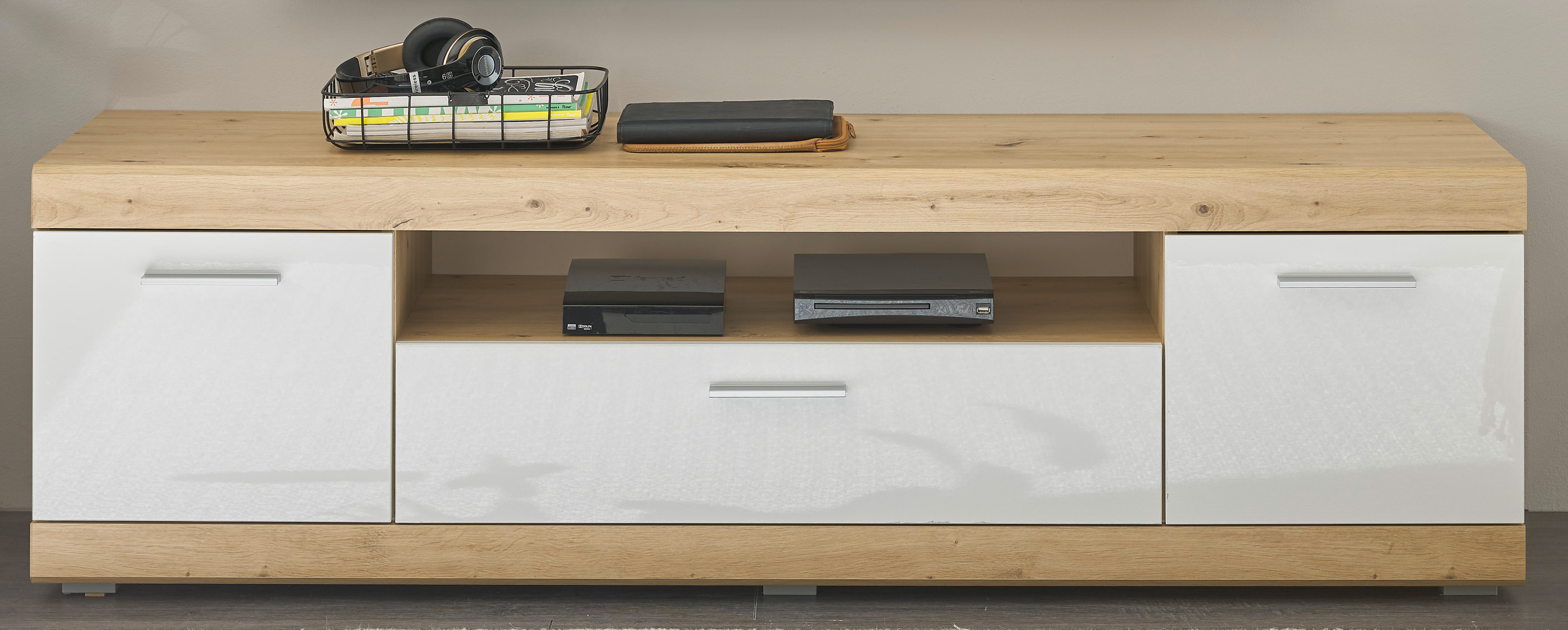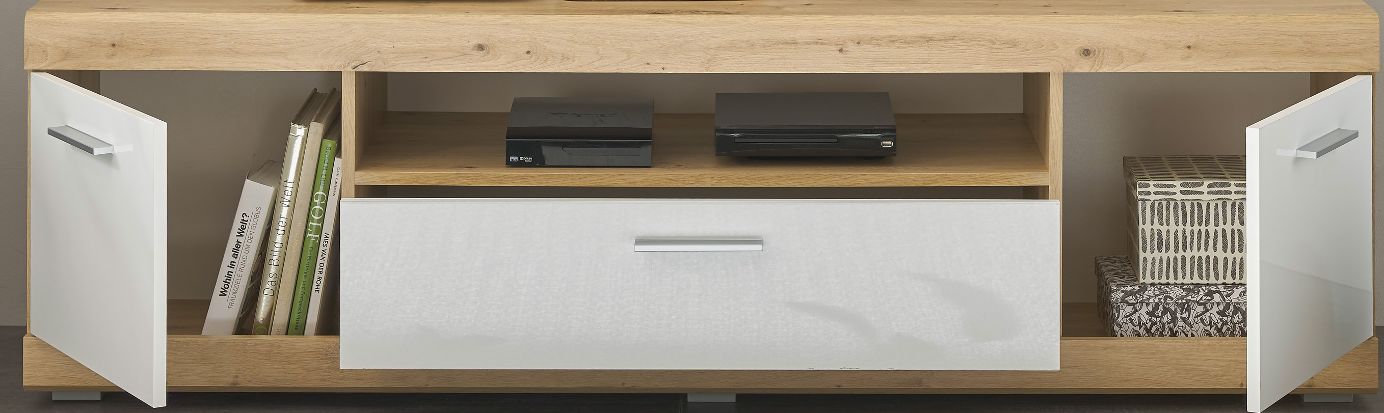 Mit dem modernen Sideboard Nola holen Sie sich ein Möbelstück mit einem wundervollen Design in Ihr Haus. Das Sideboard Nola kommt mit einer besonderen Farbkombination in Eiche und Weiß. Das macht das Sideboard Nola zu einem Möbelstück, das nahezu in jede Inneneinrichtung passt. Weiterhin bietet das Sideboard reichlich Stauraum zur Unterbringung von den unterschiedlichsten Gegenständen. Dabei können Sie auch kleinere Gegenstände wunderbar in einer der 3 Schubkästen unterbringen. Mit der modernen Optik und dem großen Stauraum eignet sich das Sideboard Nola auch wunderbar zur Unterbringung von Akten in Büroräumen, und macht dabei einen tollen Eindruck.