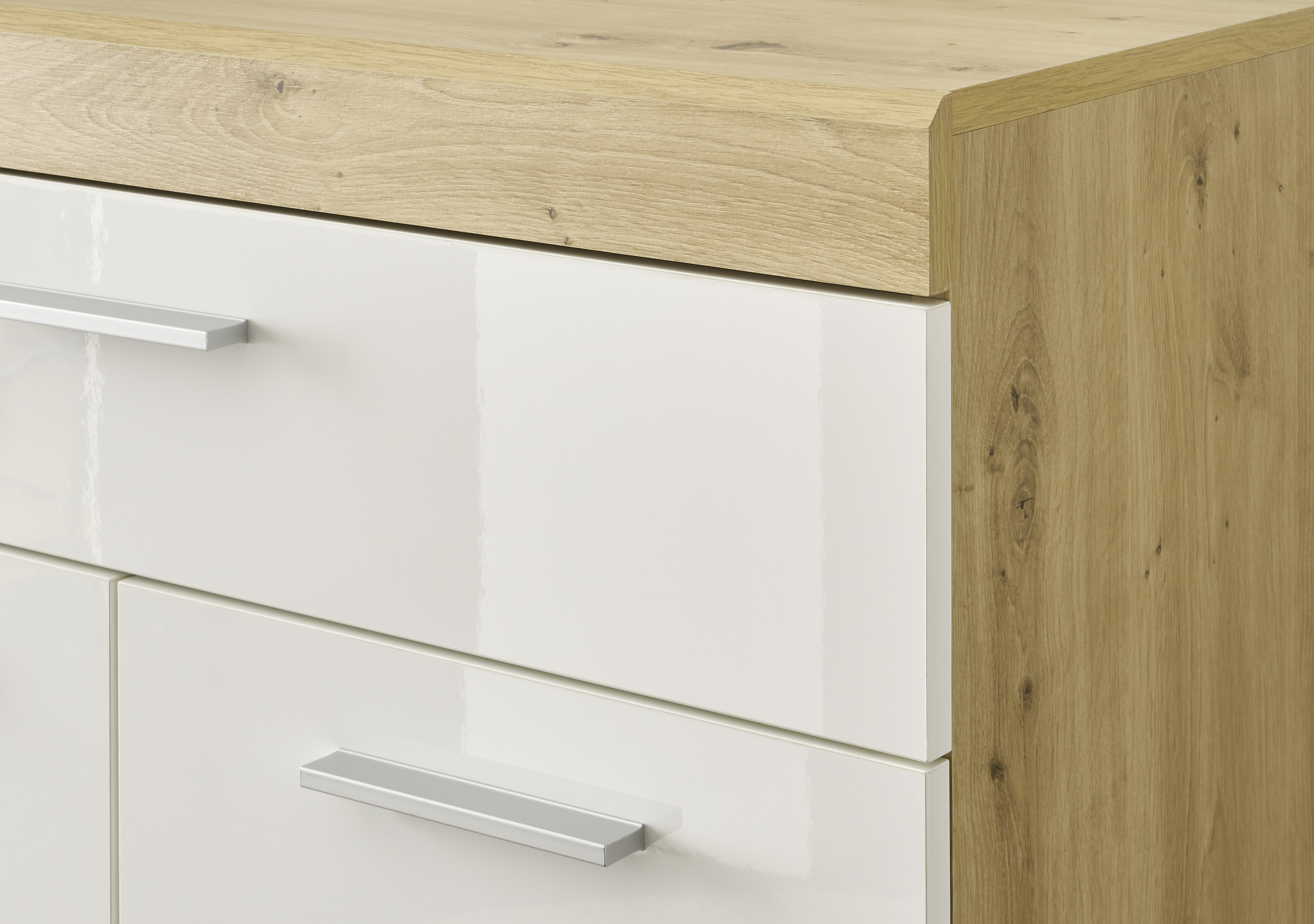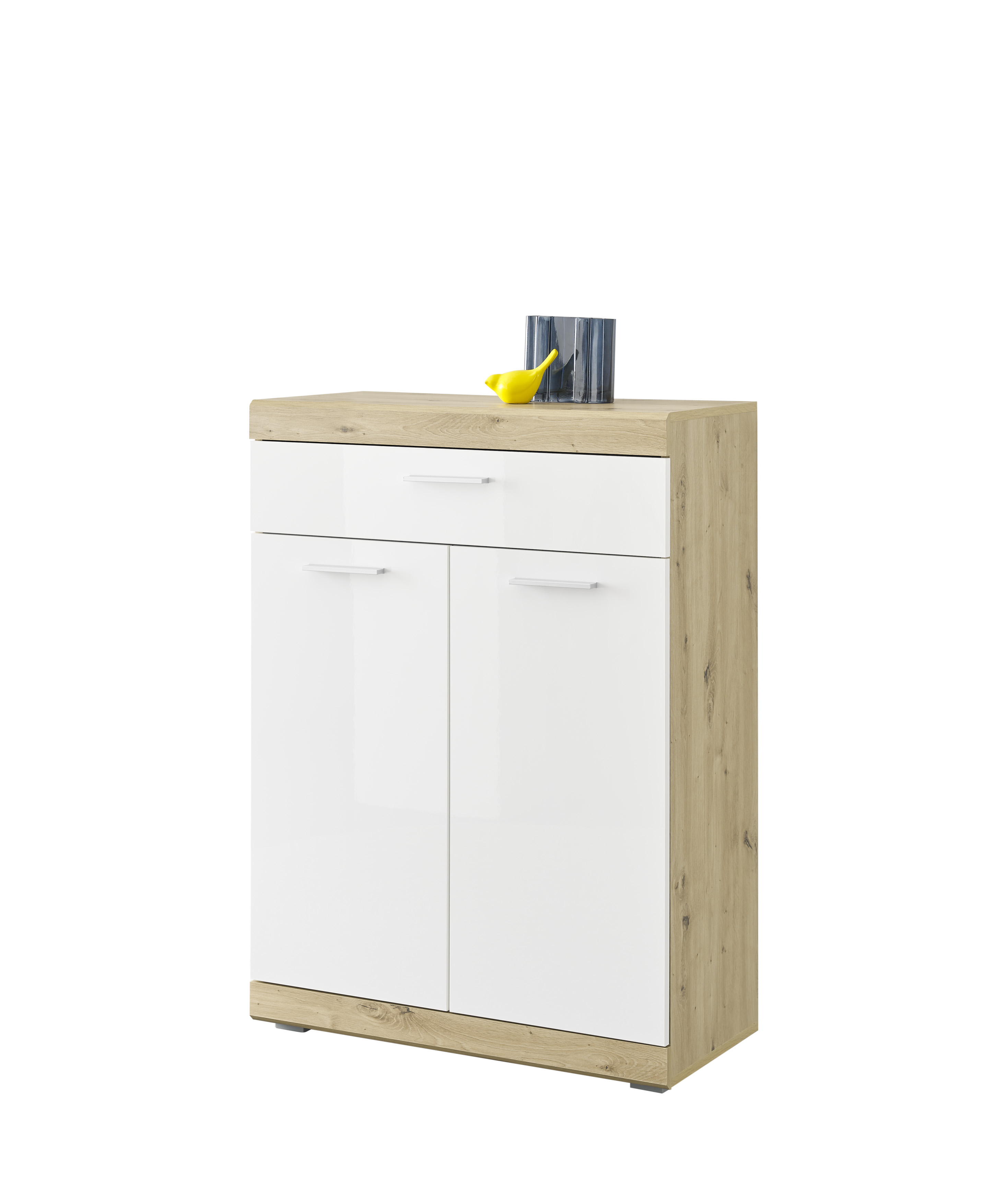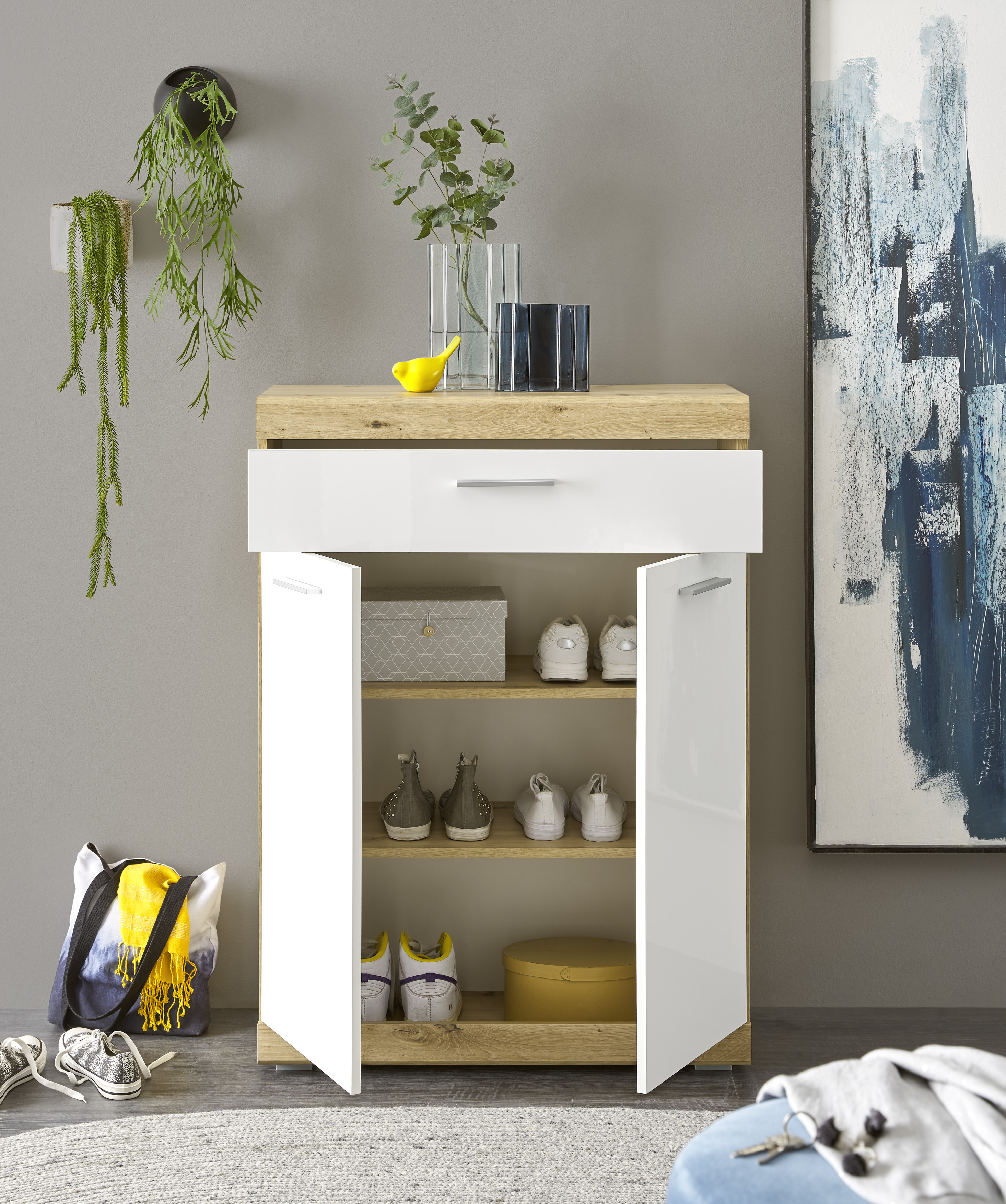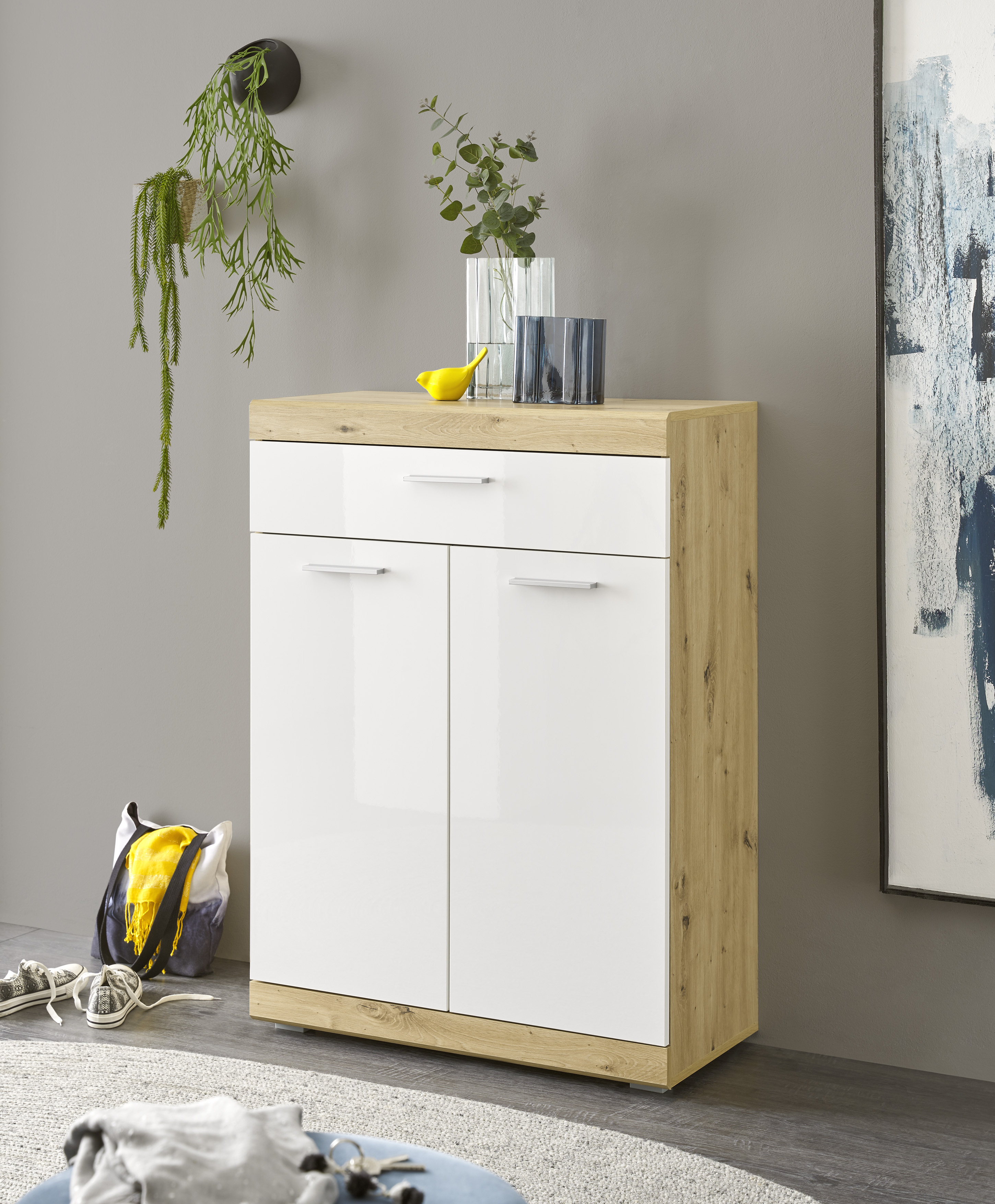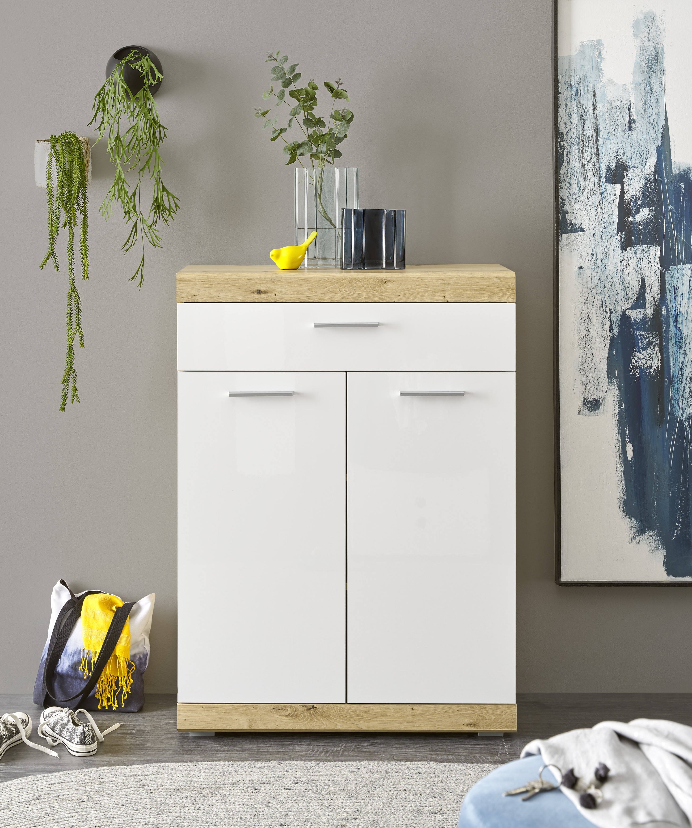 Der zweitürige Garderobenschrank Nola bringt das gewisse Etwas in Ihren Flur. Neben seinem glänzenden ßußeren kann er auch mit inneren Werten punkten, denn mit seiner Kleiderstange und dem Einlegeboden entpuppt sich dieser schicke Garderobenschrank als stilvolle Lagermöglichkeit für Ihre Jacken, Mäntel, Handtaschen und anderen Accessoires. Der weiße und Eichefarbenen Korpus des Garderobenschranks gibt diesen ein formvollendetes Gesamtbild. Durch die schicke Optik wirkt das Möbel als frisches Highlight in jedem Flur. Das komplette Garderobenprogramm Nola ist ein idealer Problemlöser für benötigten Stauraum auch in engen oder kleinen Fluren.