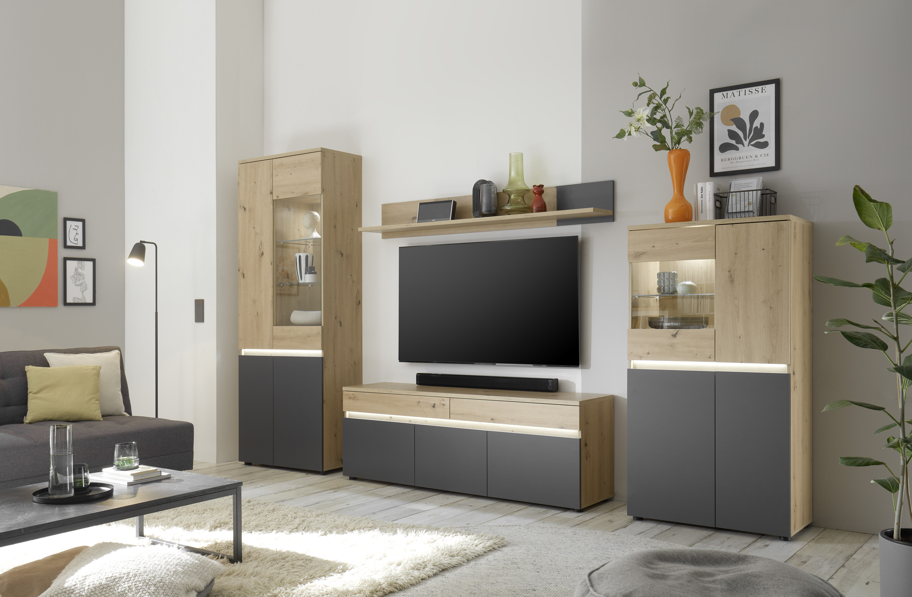 Entdecken Sie das tolle und stilvolle Highboard Lille. Mit dem modernen Design und der wundervollen Farbkombination aus Artisan Eiche und Anthrazit passt sich das Highboard Lille perfekt Ihren Wohnbereich an, und wertet diesen mit seiner Ausstrahlung auf. Untermalt wird die Optik des Highboards nur durch Ihre Dekorationen oder Ihre Accessoires. Diese können Sie dank der Beleuchtung des Highboards Lille perfekt in Szene setzen. Holen Sie sich jetzt Ihr neues Highboard Lille, und bereichern Sie Ihren Wohnbereich mit einem modernen Design.