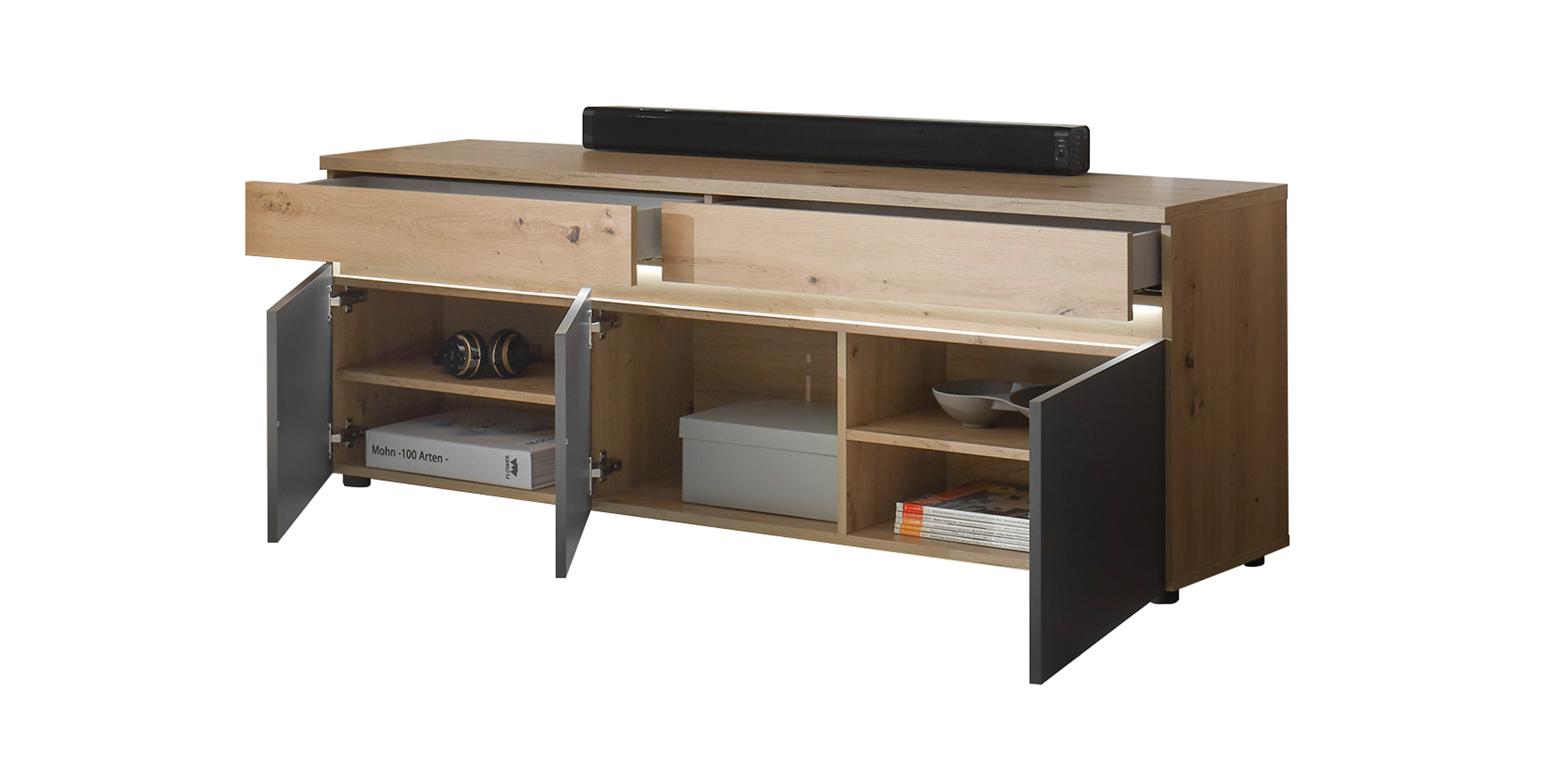 Holen Sie sich jetzt das tolle und stilvolle Sideboard Lille. Mit dem modernen Design und der tollen Farbkombination aus Artisan Eiche und Anthrazit passt sich das Sideboard Lille perfekt Ihren Wohnbereich und Durchgangsbereich an, und wertet diesen mit der modernen Ausstrahlung auf. Dank der vielen Stauraummöglichkeiten, können Sie ganz leicht Ihre Dekorationen oder Accessoires in dem Sideboard Lille unterbringen, ohne dass diese Ihnen die Optik Ihrer Einrichtung negativ beeinflusst. Holen Sie sich jetzt Ihr neues Sideboard Lille, und bereichern Sie Ihren Wohnbereich mit einem modernen Design und großzügigen Stauraum!