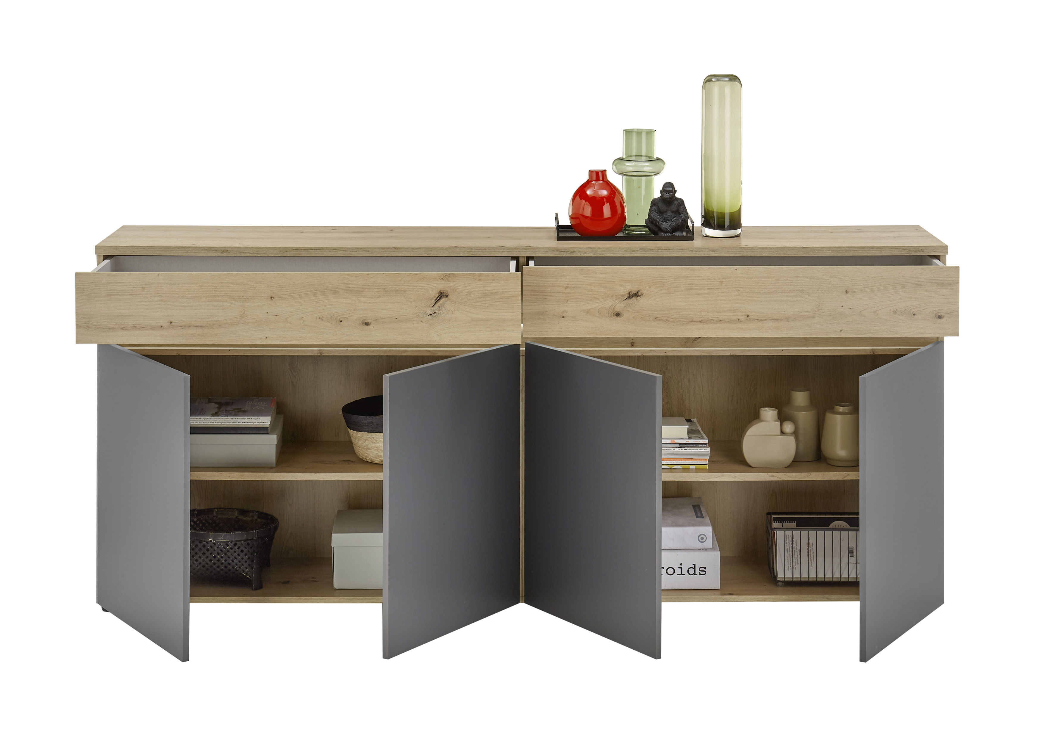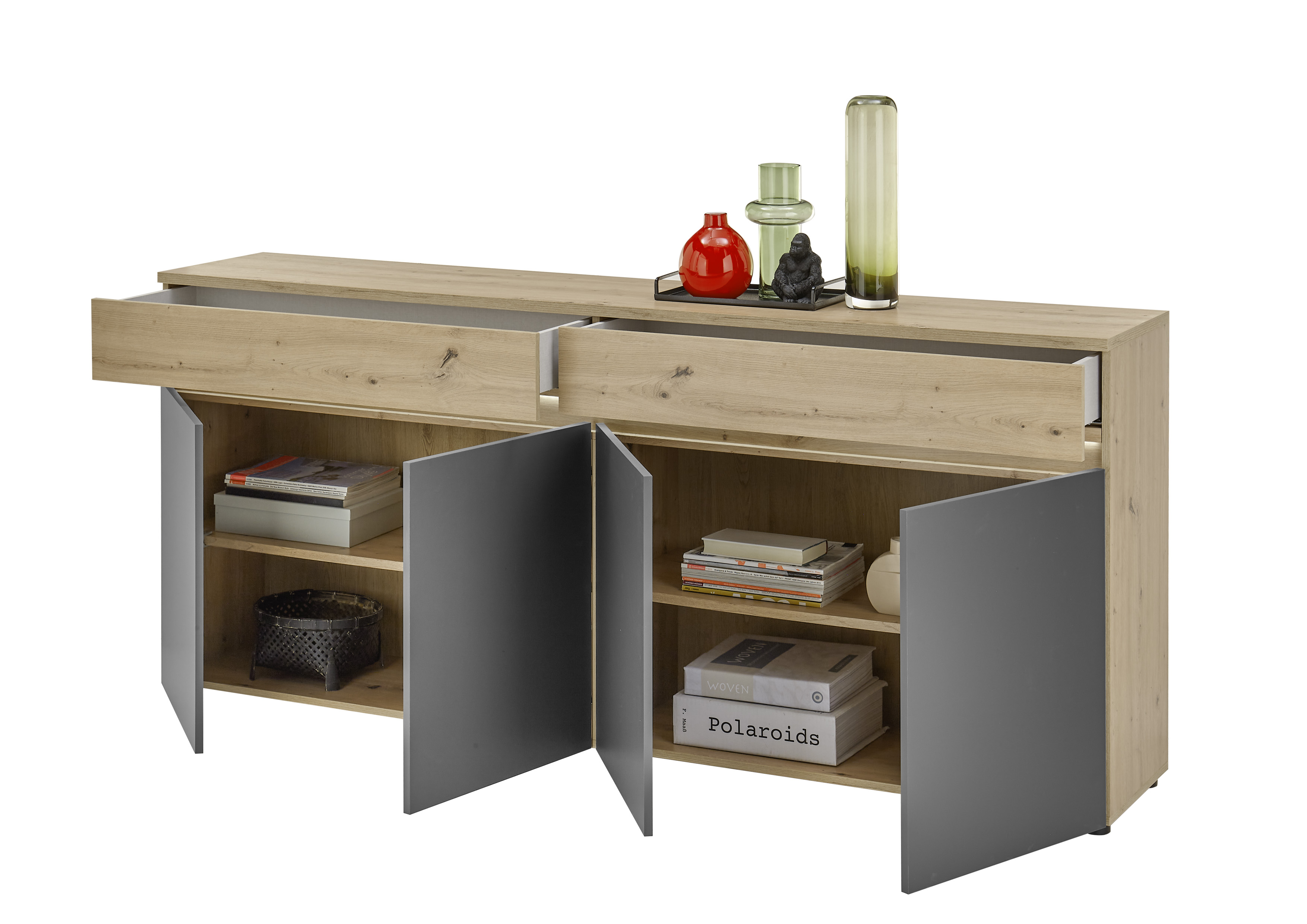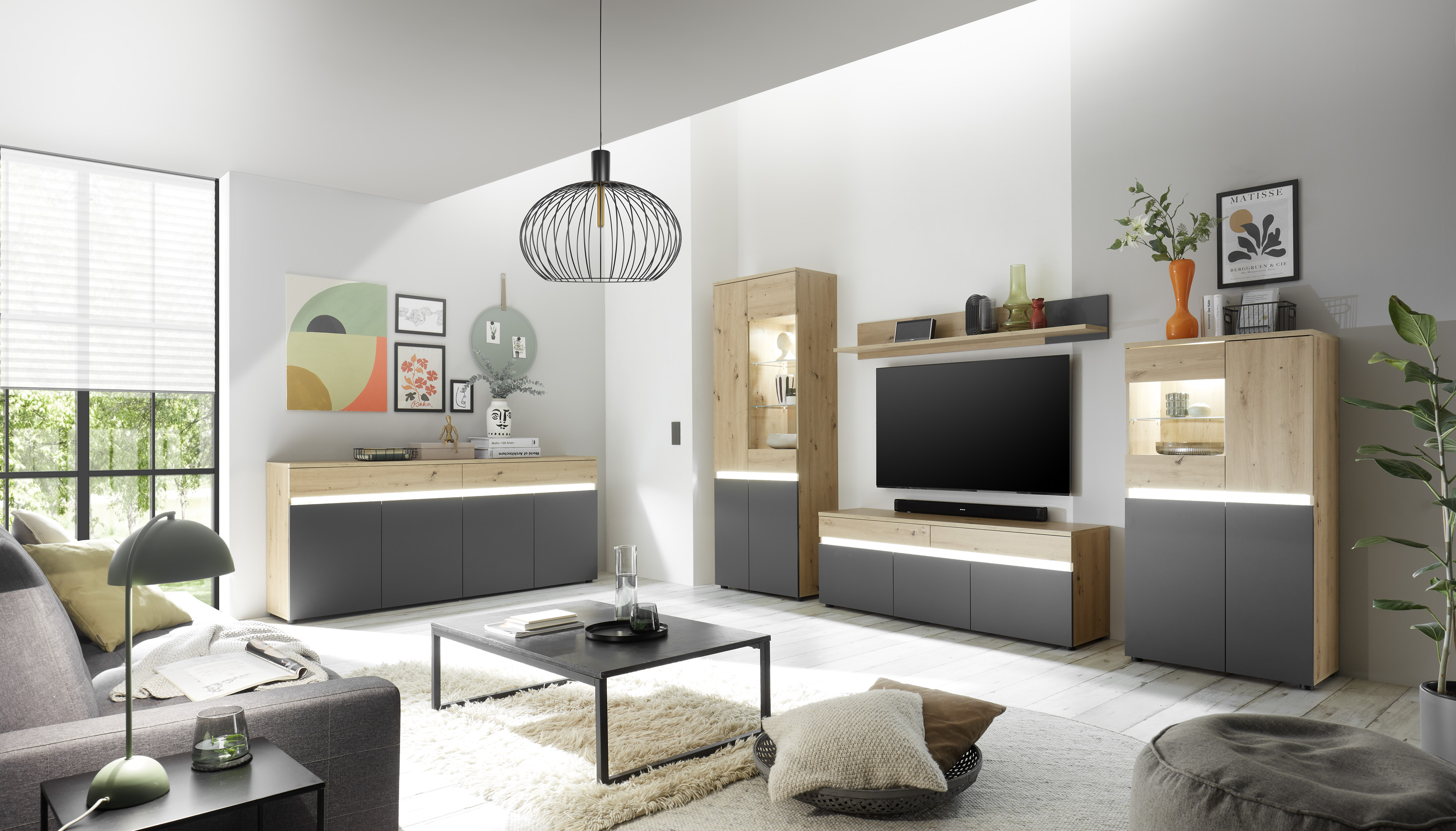 Entdecken Sie das tolle und stilvolle Highboard Lille. Mit dem modernen Design und der wundervollen Farbkombination aus Artisan Eiche und Anthrazit passt sich das Highboard Lille perfekt Ihren Wohnbereich an, und wertet diesen mit seiner Ausstrahlung auf. Untermalt wird die Optik des Highboards nur durch Ihre Dekorationen oder Ihre Accessoires. Diese können Sie dank der Beleuchtung des Highboards Lille perfekt in Szene setzen. Holen Sie sich jetzt Ihr neues Highboard Lille, und bereichern Sie Ihren Wohnbereich mit einem modernen Design.