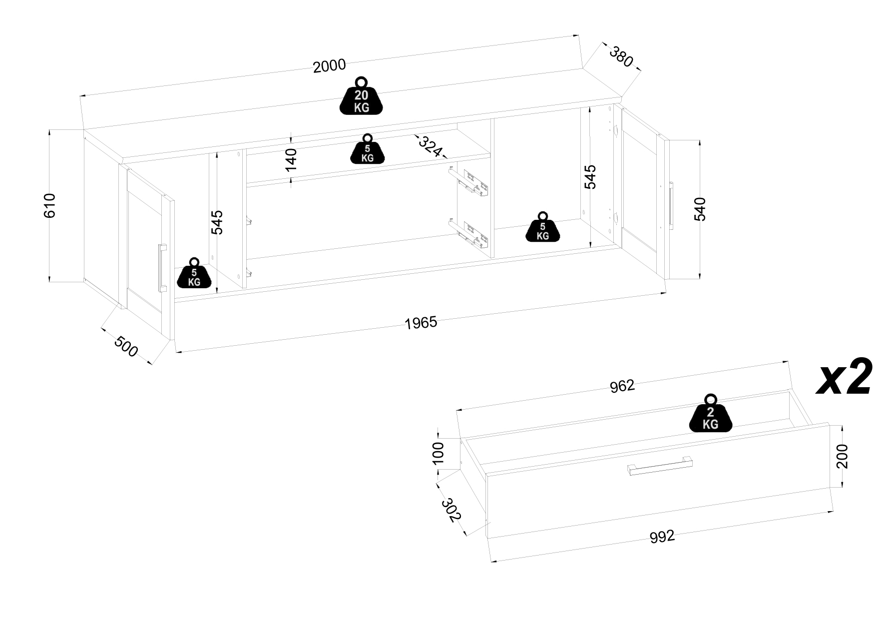 | Lowboard (B/H/T) ca.: | 200 x 60 x 38 cm |